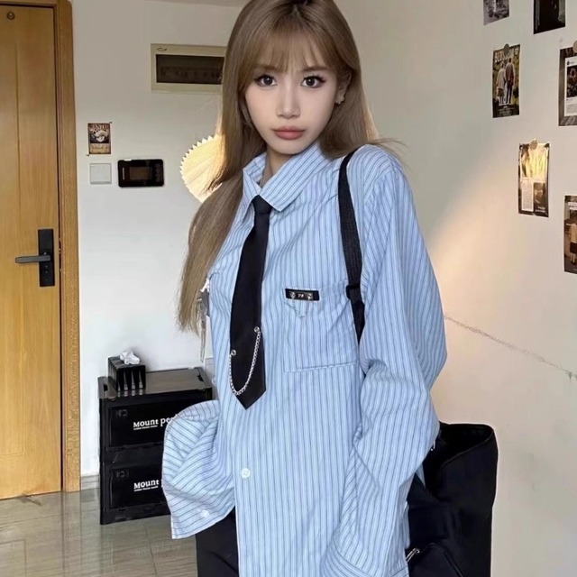 トップス シャツ 長袖 襟付き 前開き ボタン 胸ポケット ネクタイ バッジ ミディアム丈 かわいい 可愛い 大人可愛い きれいめ シンプル 上品 レトロ おしゃれ かっこいい カジュアル レトロ こなれ感 個性的 主役級 存在感 抜け感 春 夏 ベーシック ナチュラル メンズライク ストライプ柄 女性用 レディース ママ OL 通勤 オフィス 学生 通学 デート お出かけ お泊まり 女子会 旅行 休日 カフェ ショッピング コンパ 普段使い デイリー 着回し 重ね着 S M L XL トレンド モテ