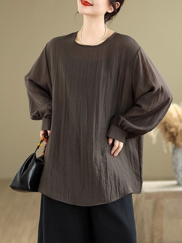 レディース トップス シャツ ブラウス ミモレ 丈長 長袖 萌袖 ラウンドネック 襟なし ストレート Iライン フォーマル タック シフォン 透け感 薄手 大人可愛い きれいめ シンプル 上品 おしゃれ レトロ こなれ感 マニッシュ モード系 フォーマル とろみ感 抜け感 都会的 クラシカル ベーシック 無地 春 秋 発表会 授業参観 会議 MTG プレゼン オフィス ビジネス OL 通勤 パーティー イベント 女子会 ガーデン 合コン コンパ 婚活 普段使い 着回し 清楚 定番 M L XL 2XL