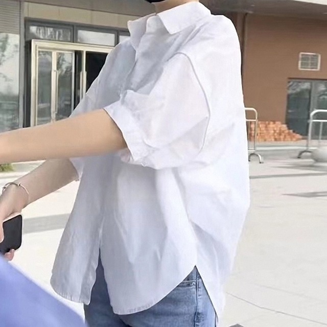 トップス シャツ 5分袖 襟付き ボタン サイドスリット かわいい 可愛い 大人可愛い きれいめ シンプル 上品 レトロ おしゃれ かっこいい カジュアル こなれ感 ルーズ 個性的 主役級 存在感 抜け感 春 夏 ベーシック ナチュラル クール 無地 女性用 レディース ママ OL 通勤 オフィス 学生 通学 デート お出かけ お泊まり 女子会 旅行 休日 カフェ ショッピング 会議 MTG イベント コンパ 普段使い デイリー 着回し 重ね着 トレンド モテ フリーサイズ