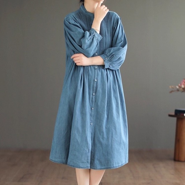 ピンタック バンドカラー レディース ワンピース シャツワンピ 膝丈 膝下 ミモレ 7分袖 ドロップショルダー ポケット 前開き ボタン ギャザー デニム ブルーデニム シンプル カジュアル 上品 おしゃれ こなれ感 抜け感 春 秋 ママ 学生 学校 通学 デート お出かけ イベント 旅行 公園 女子会 休日 ショッピング ライブ お花見 カフェ フェス コーデ 体型カバー 普段使い 着回し ゆったり ゆる フリーサイズ ブルー ライトブルー