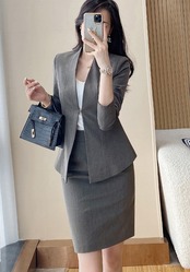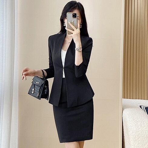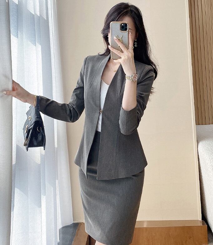 長袖のジャケットとミディアム丈のタイトスカートがセットになったこちらのスーツセットは、シンプルながらも存在感抜群のデザインです。