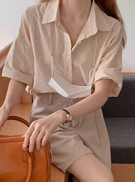 レディース シャツ 半袖 5分袖 Vネック 薄手 かわいい 大人可愛い シンプル カジュアル こなれ感 ラフ ガーリー ルーズ クール モード系 エレガント モダン 主役級 存在感 フォーマル とろみ感 抜け感 ヴィンテージ クラシカル 学生風 ベーシック ストライプ 春 夏 ママ マタニティ 通勤 学生 学校 デート お出かけ お泊まり アウトドア キャンプ パーティー イベント リゾート | SPARKJOY レディースファッション