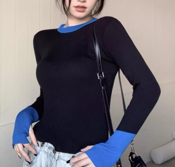 レディース トップス ロンT ニット 長袖 フィンガーデザイン ラウンドネック 襟なし スリム 細身 ストリート バイカラー 配色 中厚手 リブニット シンプル レトロ アジアン こなれ感 ラフ ルーズ ヴィンテージ クラシカル 学生風 無地 秋 冬 ロングシーズン 学校 通学 部活 アウトドア 旅行 公園 女子会 休日 ライブ 重ね着 韓国 コーデ 楽ちん 暖かい 防寒 プチプラ 普段使い 着回し S M L 黒 ブラック ブルー バイカラー モノトーン ベーシックカラー 秋カラー | SPARKJOY レディースファッション