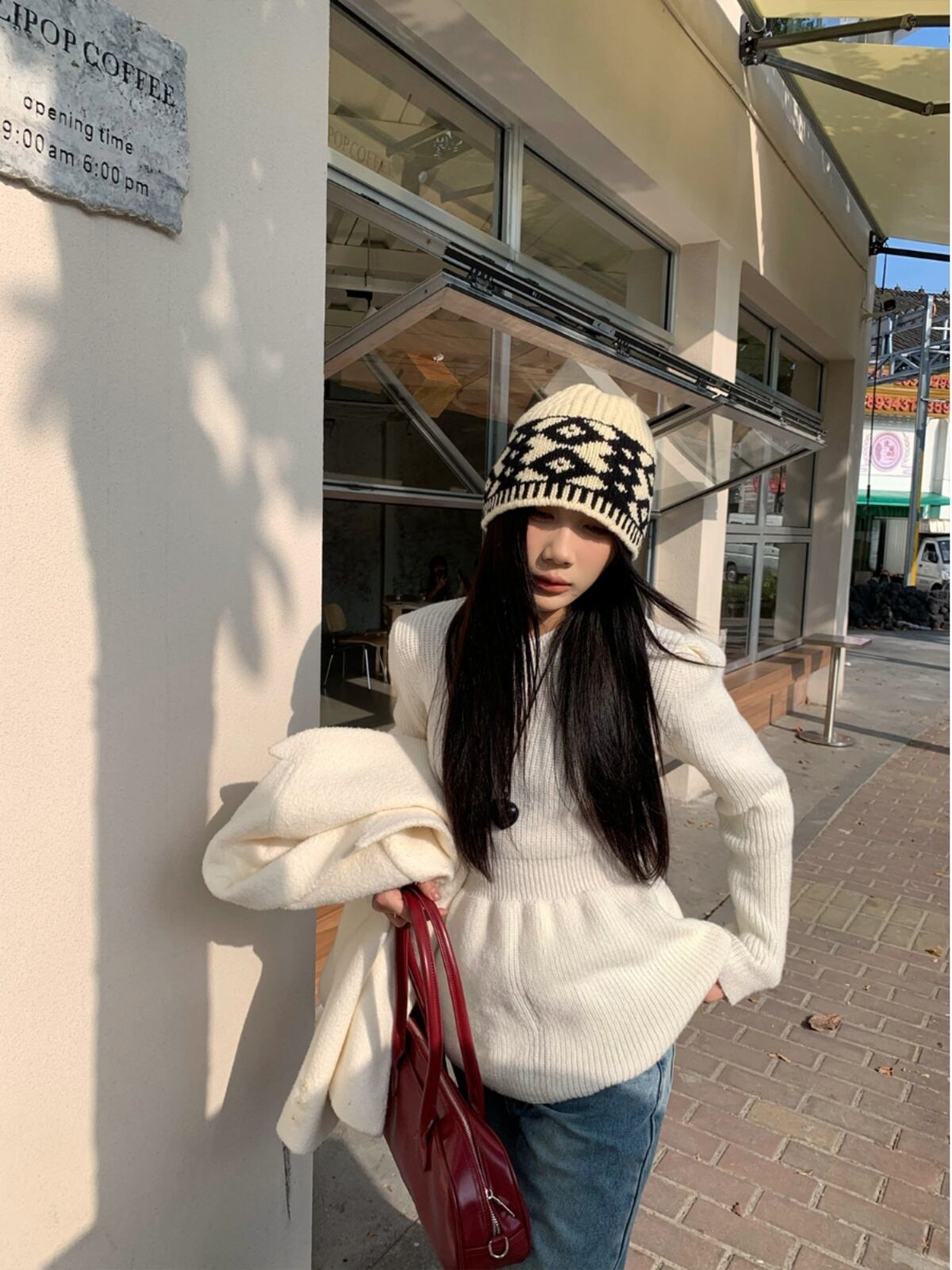 レディース トップス ニット セーター プルオーバー ミディアム 長袖 クルーネック 襟なし スリム 細身 Aライン フェミニン ハイウエスト 切り替えデザイン 伸縮性 かわいい 大人可愛い きれいめ シンプル カジュアル 上品 おしゃれ こなれ感 無地 秋 冬 ママ オフィス OL 通勤 学生 学校 通学 デート お出かけ 旅行 公園 女子会 休日 ショッピング 合コン コンパ カフェ 韓国 オルチャン コーデ 体型カバー 脚長 普段使い 着回し S M L オフホワイト ブルー 大人カラー | SPARKJOY レディースファッション