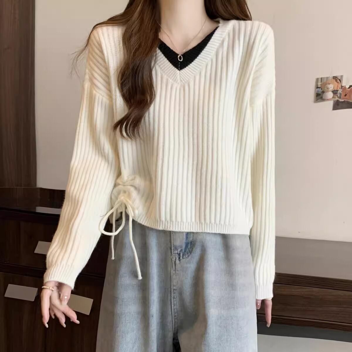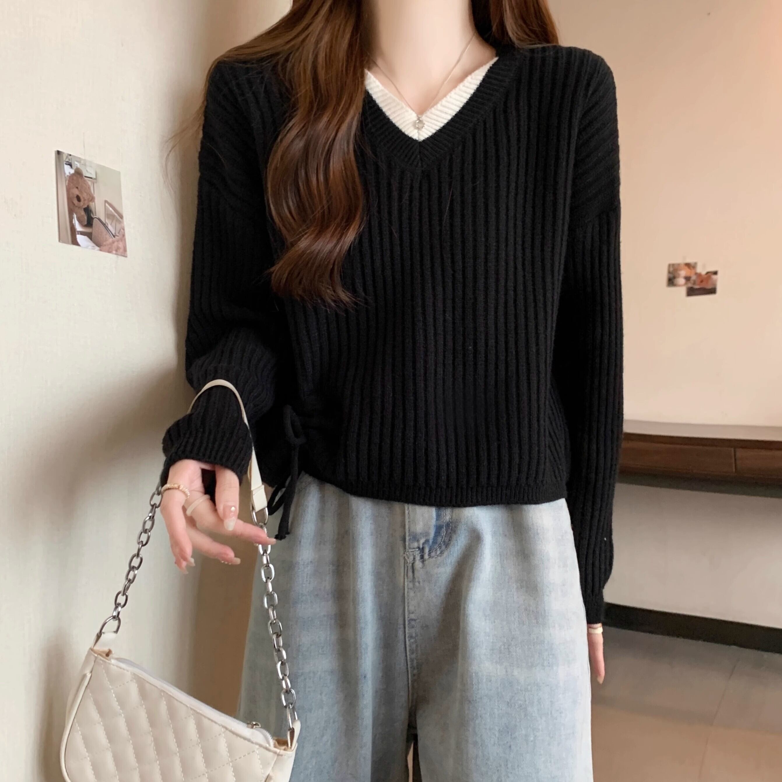 トップス セーター 長袖 Vネック プルオーバー ショート丈 重ね着風 サイドリボン 萌え袖 かわいい 大人可愛い きれいめ シンプル 上品 おしゃれ かっこいい カジュアル こなれ感 個性的 主役級 ルーズ 存在感 抜け感 秋 冬 ベーシック ナチュラル キュート クール 無地 女性用 レディース ママ OL 通勤 オフィス 学生 通学 デート お出かけ お泊まり 女子会 旅行 休日 アウトドア カフェ ショッピング コンパ イベント 普段使い デイリー 着回し 重ね着 S M L XL トレンド | SPARKJOY レディースファッション