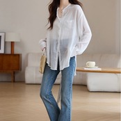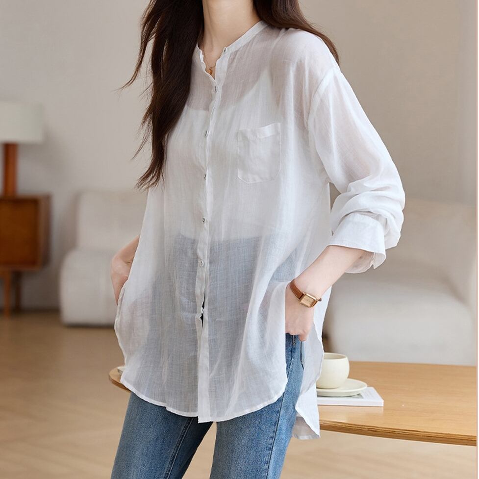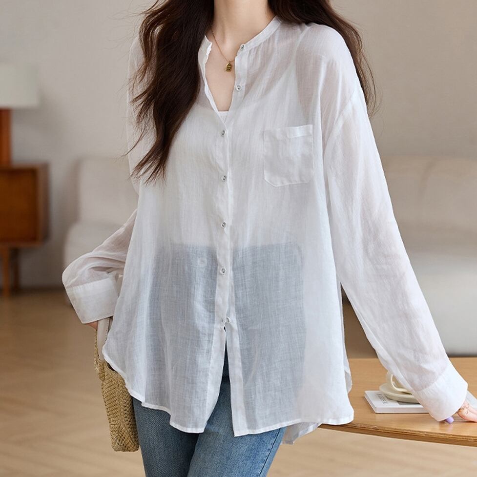 トップス シャツ シアーシャツ ノーカラーシャツ レディース ブラウス シャツブラウス シフォンシャツ 長袖シャツ クルーネックシャツ シフォンシャツ ドロップショルダー 透け感 シースルー ノーカラー かわいい 大人可愛い おしゃれ こなれ感 ガーリー エレガント 主役級 存在感 キュート きれいめ 上品 シンプル カジュアル マニッシュ 抜け感 通勤 通学 デート お出かけ イベント 旅行 女子会 休日 ショッピング 体型カバー ゆったり フェミニン | SPARKJOY レディースファッション