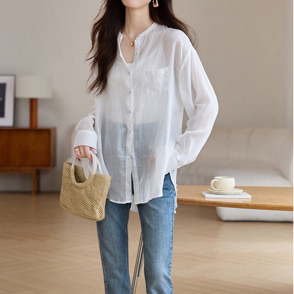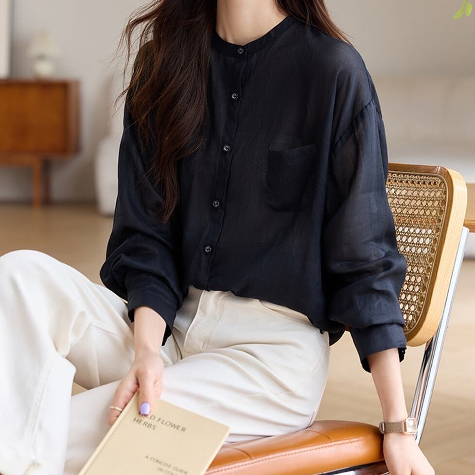 爽やかに抜けを演出するシアー素材がポイントのノーカラーシャツ。糖度ひかえめにまとまるフォルムに奥行きを加算してクールダウン。落ち着くシックな選びで気になるガーリーシルエットを大人化