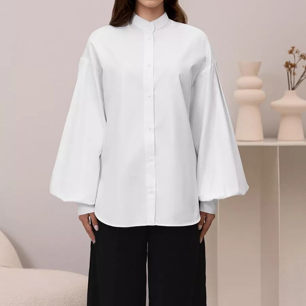 トップス シャツ ボリューム袖シャツ ノーカラーシャツ レディース 袖コンシャス 長袖 バルーンスリーブ ボリュームスリーブ 無地 ノーカラー 襟無し クルーネック ドロップショルダー 袖コンシャスシャツ ブラウス 長袖シャツ かわいい 大人可愛い おしゃれ こなれ感 ガーリー エレガント 主役級 存在感 キュート きれいめ 上品 シンプル クラシカル 通勤 通学 デート お出かけ イベント 旅行 女子会 休日 ショッピング 体型カバー ゆったり フェミニン | SPARKJOY レディースファッション