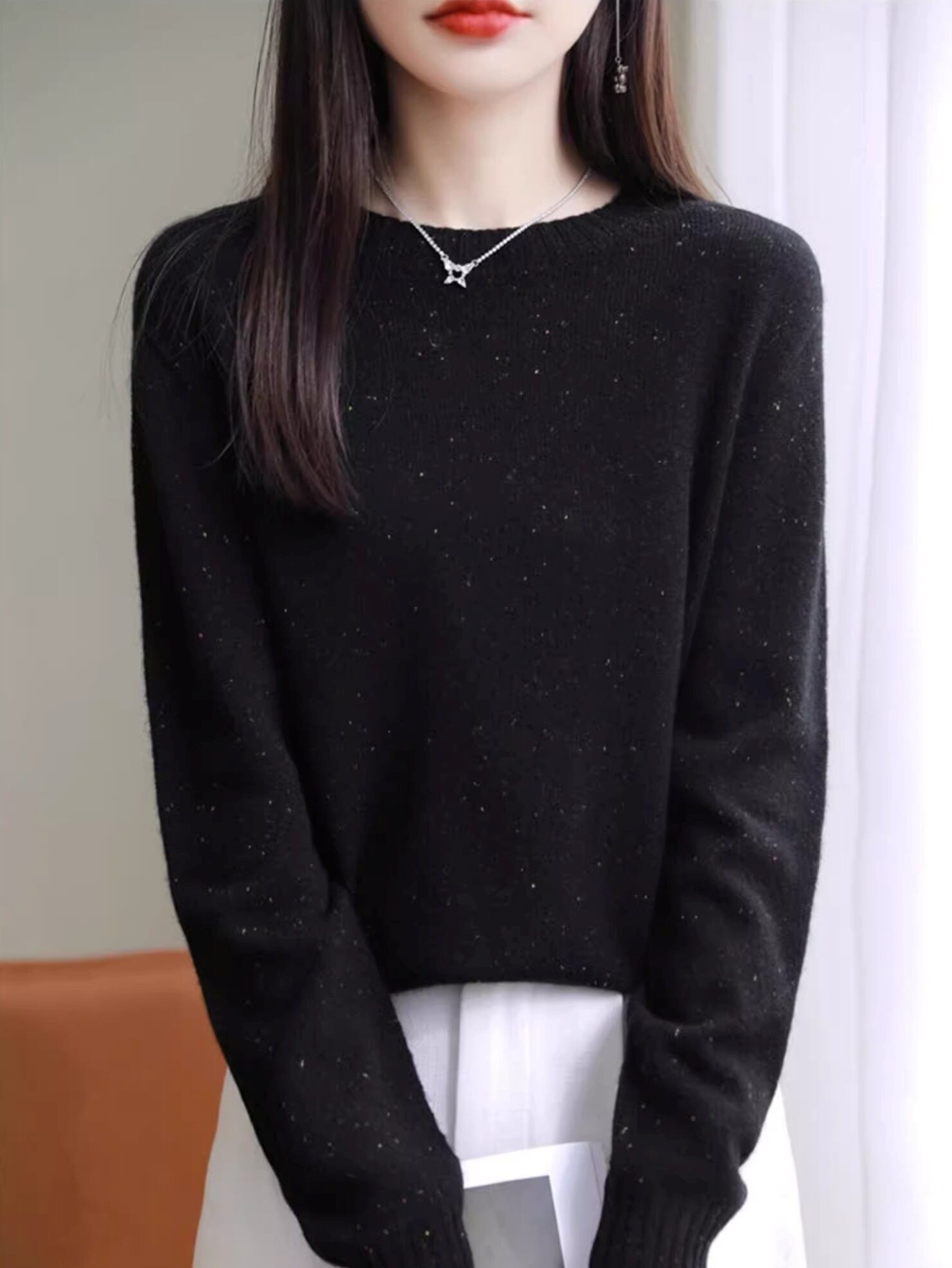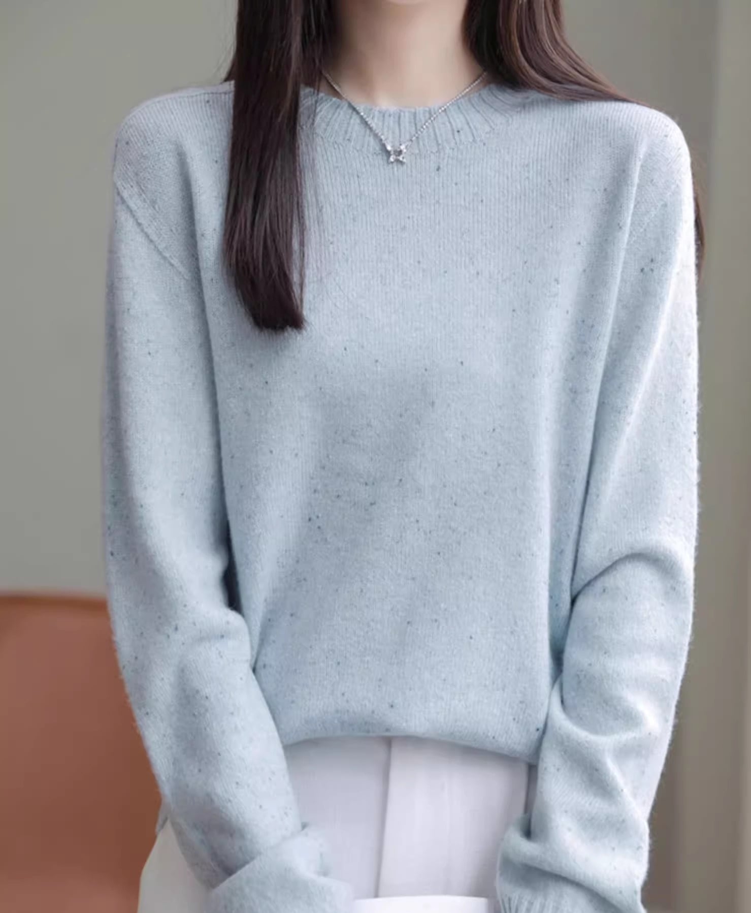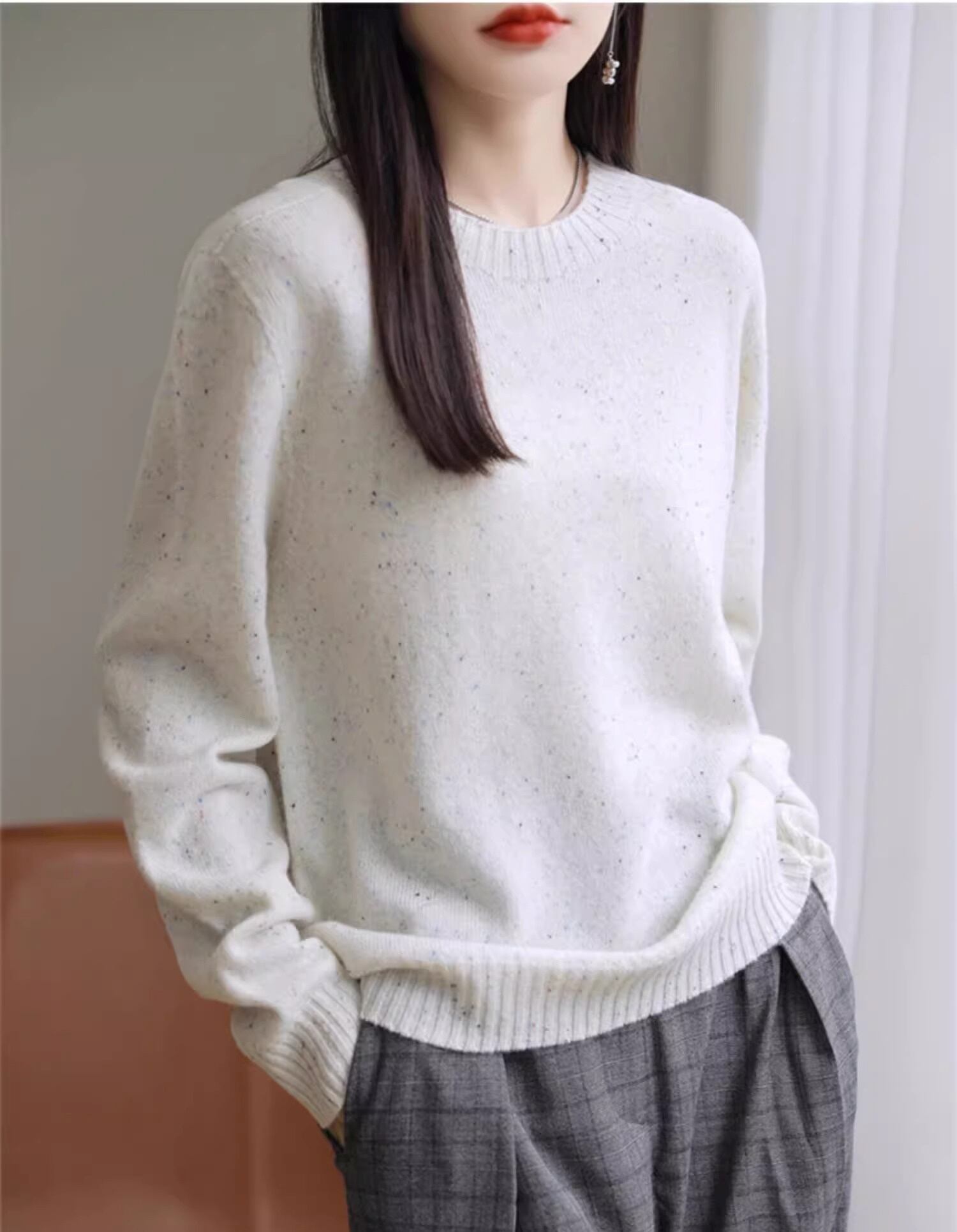 このセーターは、カジュアルにもきれいめにも合わせやすい長袖ラウンドネックプルオーバーです。