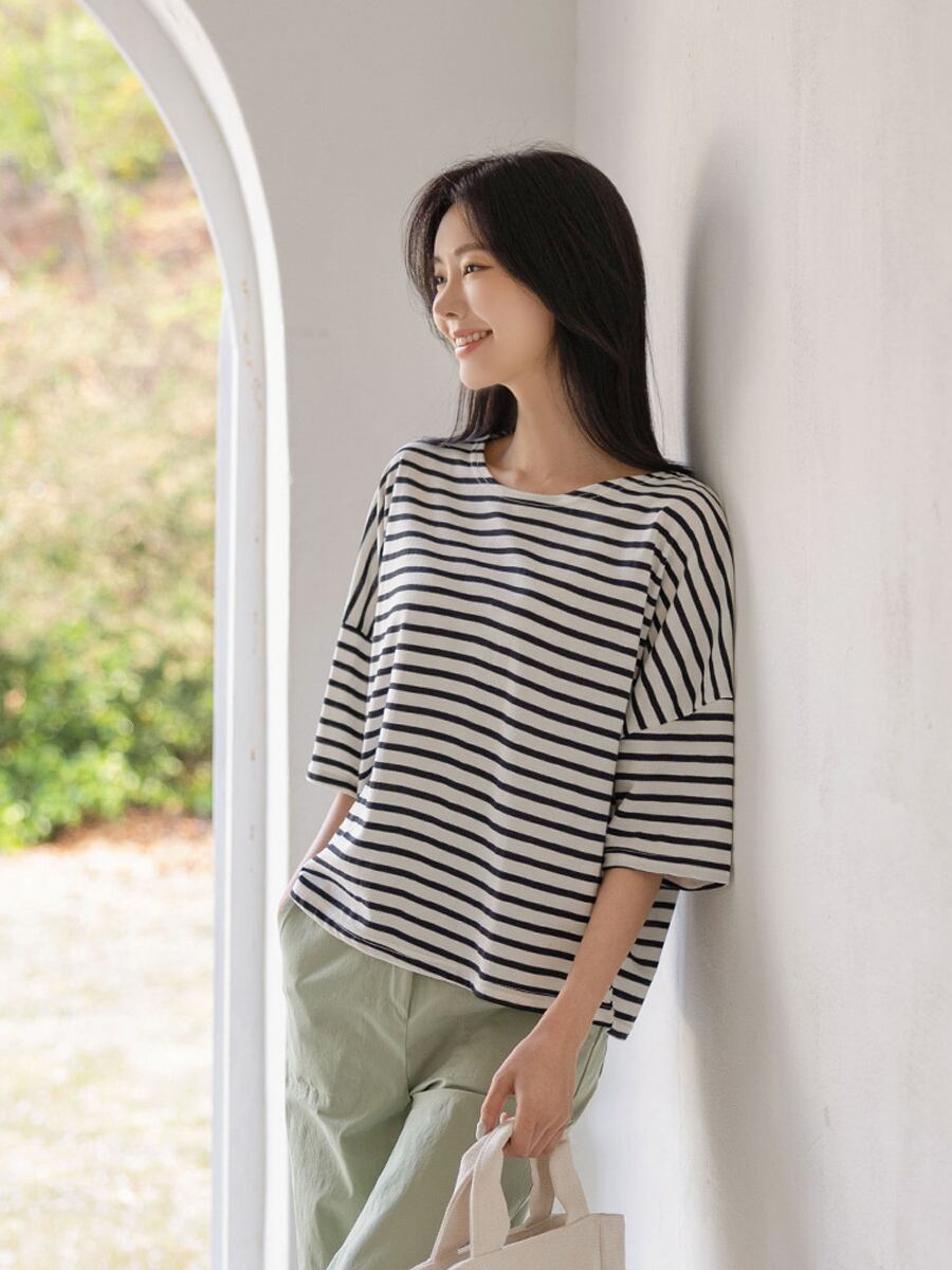 トップス カットソー Tシャツ 半袖 ラウンドネック プルオーバー ミディアム丈 かわいい 大人可愛い きれいめ シンプル 上品 おしゃれ かっこいい カジュアル こなれ感 個性的 主役級 存在感 抜け感 春 夏 ベーシック ナチュラル クール メンズライク ボーダー柄 女性用 レディース ママ マタニティ OL 通勤 オフィス 学生 通学 デート お出かけ お泊まり 女子会 旅行 アウトドア 休日 カフェ ショッピング コンパ イベント 普段使い デイリー 着回し 重ね着 M L XL ゆったり モテ | SPARKJOY レディースファッション