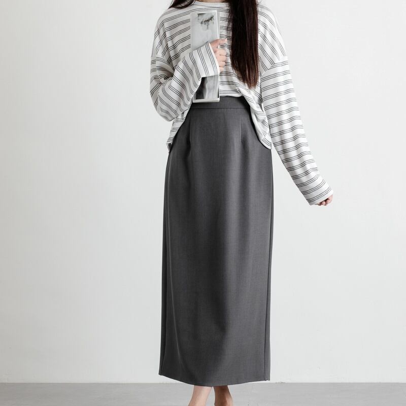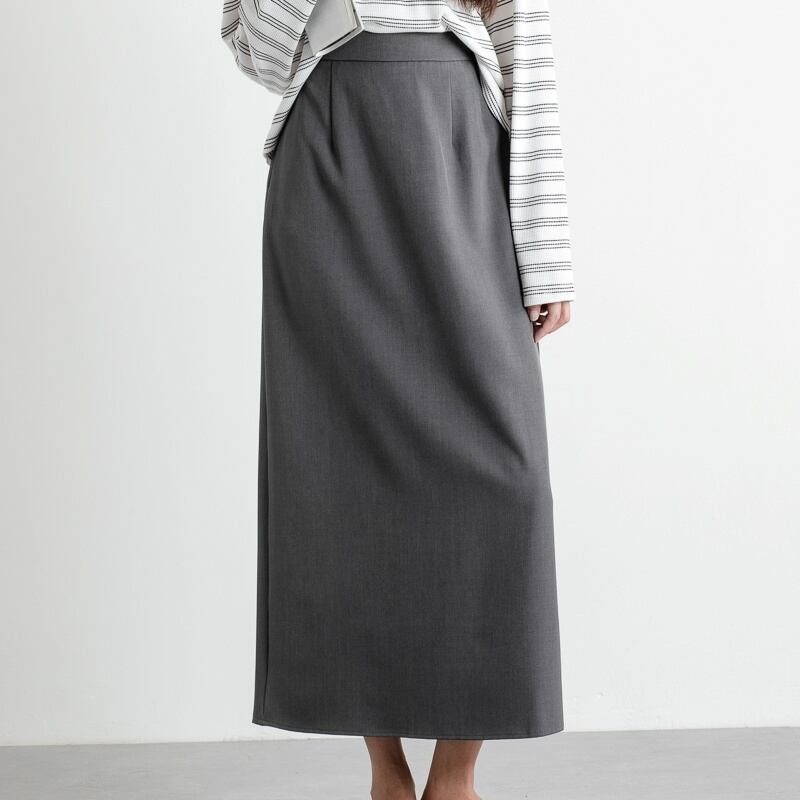 このロングスカートは、ハイウエストデザインとウエストゴム構造により、スタイリッシュかつ快適なフィット感を実現。