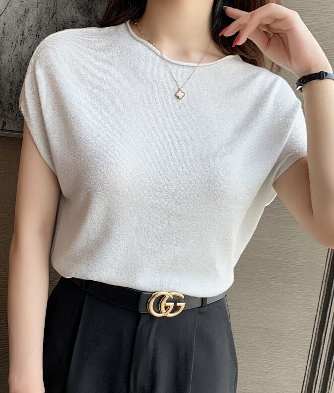 ラウンドネックのデザインが首元をスッキリ見せ、カジュアルながらも清楚感を演出します。