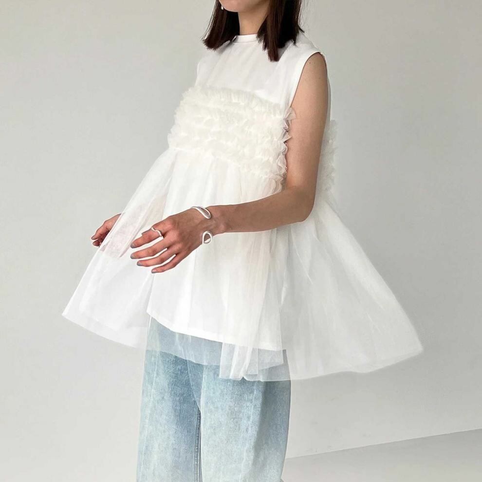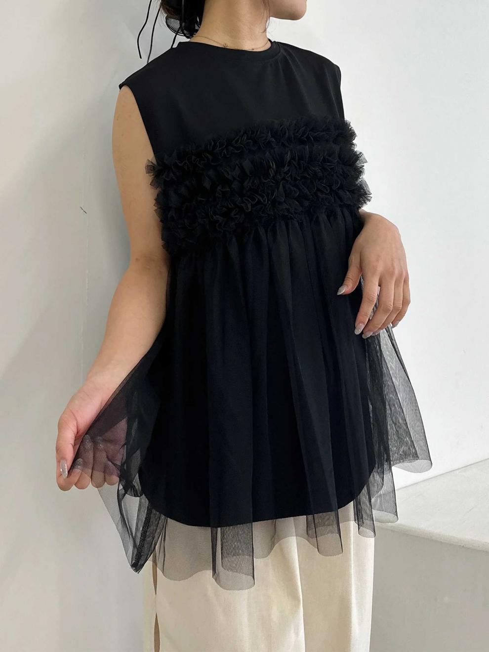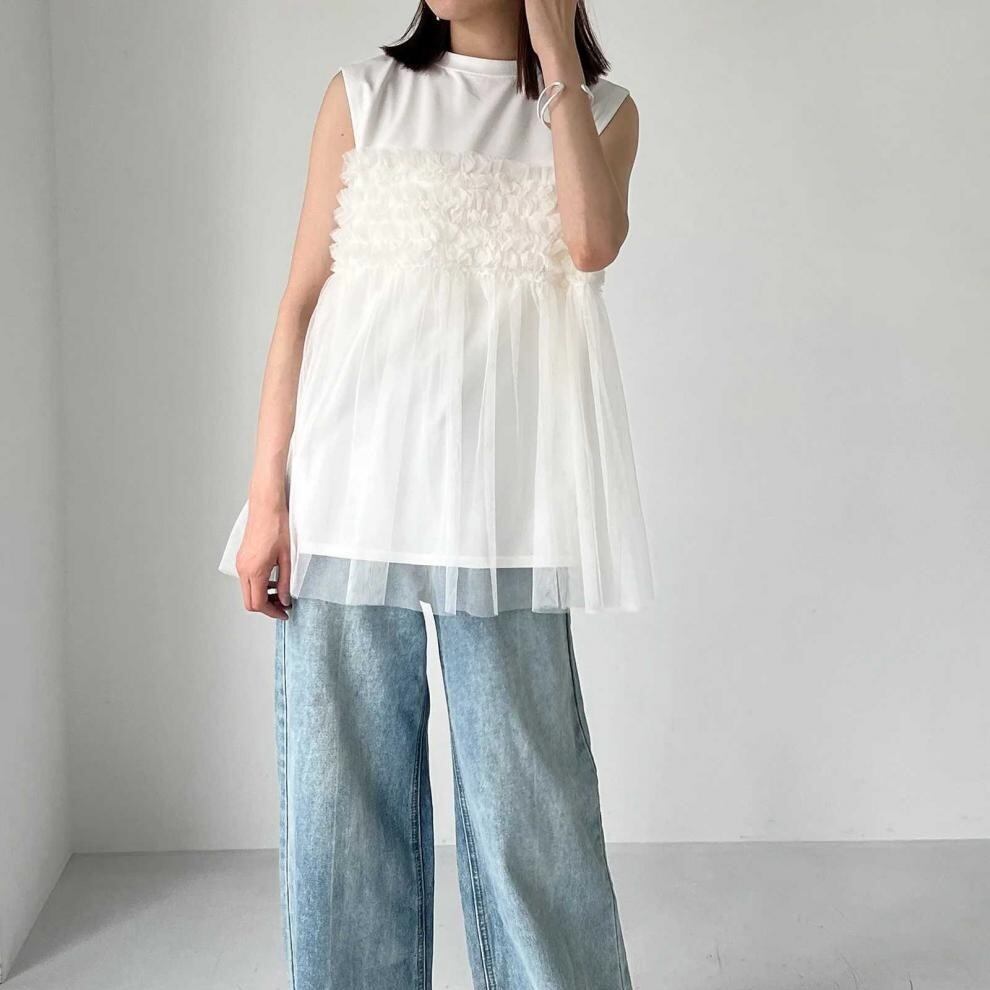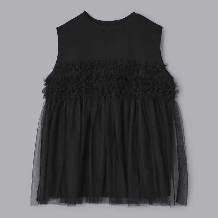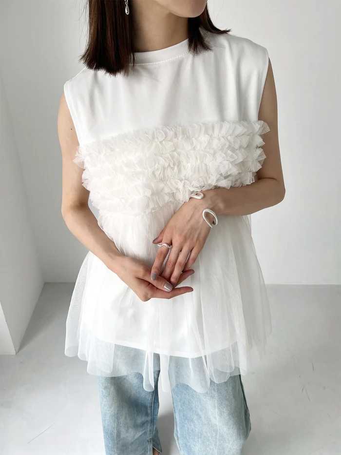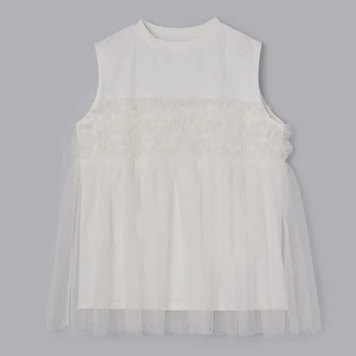 レディース トップス カットソー ノースリーブ ラウンドネック フレア チュール シフォン 切り替えデザイン かわいい 大人可愛い きれいめ シンプル 上品 おしゃれ こなれ感 ガーリー ルーズ 個性的 抜け感 キュート 都会的 ベーシック カントリー ナチュラル 無地 春 夏 ママ デート お出かけ お泊まり パーティー イベント リゾート 旅行 レストラン 女子会 休日 ホテル ショッピング 重ね着 普段使い 着回し レイヤード モテ 清楚 流行 インスタ映え 定番 ゆったり ゆる フリーサイズ | SPARKJOY レディースファッション