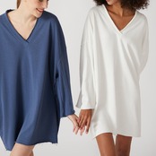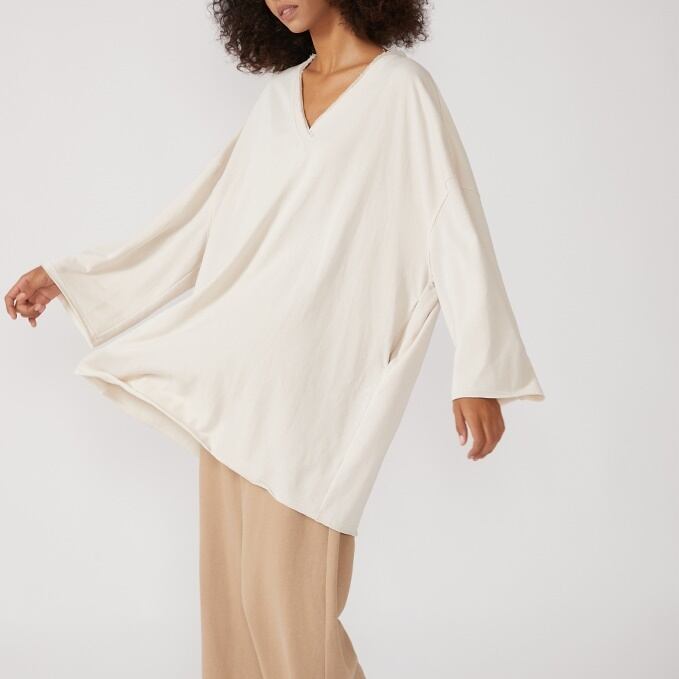 Vネックとフレアシルエットが女性らしさを引き立て、普段の部屋着からちょっとしたお出かけまで幅広く活躍します。