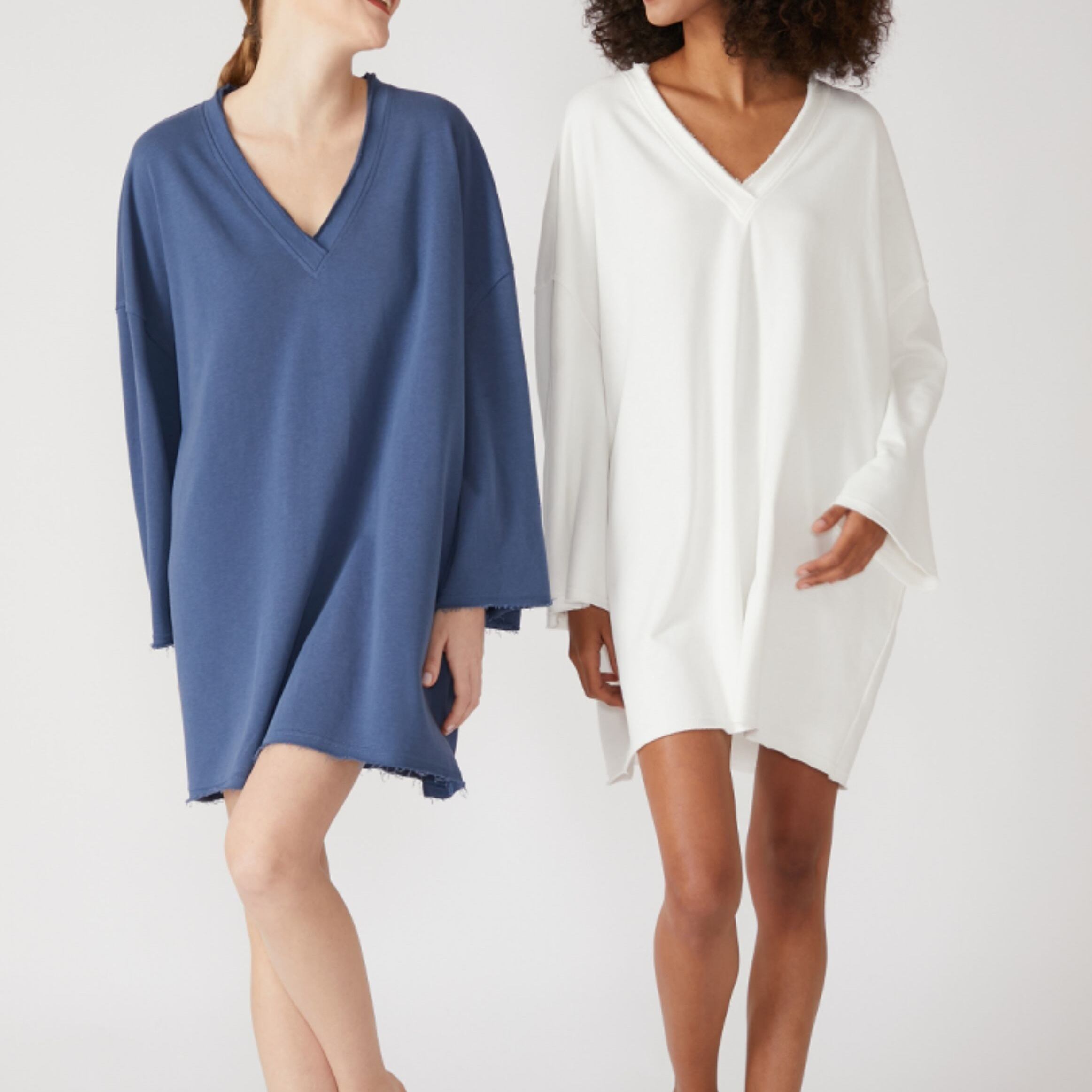 レディース トップス ワンピース ルームウェア パジャマ 部屋着 膝上 長袖 Vネック フレア かわいい きれいめ シンプル カジュアル こなれ感 ラフ 無地 オールシーズン ペア 男女兼用 ユニセックス ママ マタニティ カップル デート お泊まり 旅行 公園 女子会 休日 重ね着 お揃い 双子 韓国 オルチャン コーデ 楽ちん 体型カバー 美脚 脚長 普段使い 着回し モテ 流行 インスタ映え 定番 S M ゆったり ゆる ホワイト ブラック グレー イエロー オフホワイト ピンク ブルー グリーン | SPARKJOY レディースファッション