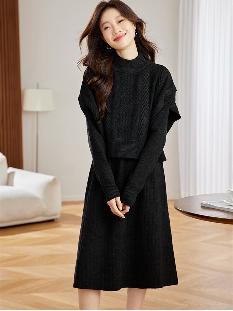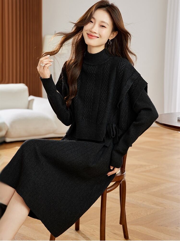 レディース ワンピース トップス ニット セーター セットアップ フレア ニットスカート 膝下 ミモレ 長袖 ハイネック フェミニン リブニット 大人可愛い きれいめ 上品 無地 OL 通勤 デート お出かけ お泊まり レストラン 女子会 休日 ホテル ショッピング コンサート ライブ 合コン コンパ カフェ アースカラー モノトーン オルチャン コーデ 楽ちん 暖かい 体型カバー 美脚 脚長 普段使い 着回し モテ 清楚 インスタ映え M L XL 2XL 3XL ゆったり ブラック ブラウン グレー | SPARKJOY レディースファッション