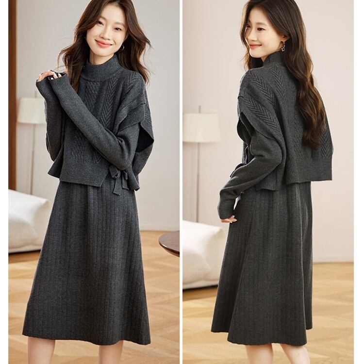 フェミニンな雰囲気を醸し出すフレアスカートは、膝下のミモレ丈で女性らしさを引き立てます。ハイネックデザインが首元をおしゃれに演出し、温かさもバッチリ。
