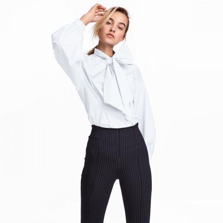抜け感のあるデザインが魅力のこちらの長袖シャツは、前開きボタンとボウタイが特徴で、シンプルながらも上品な印象を持っています。