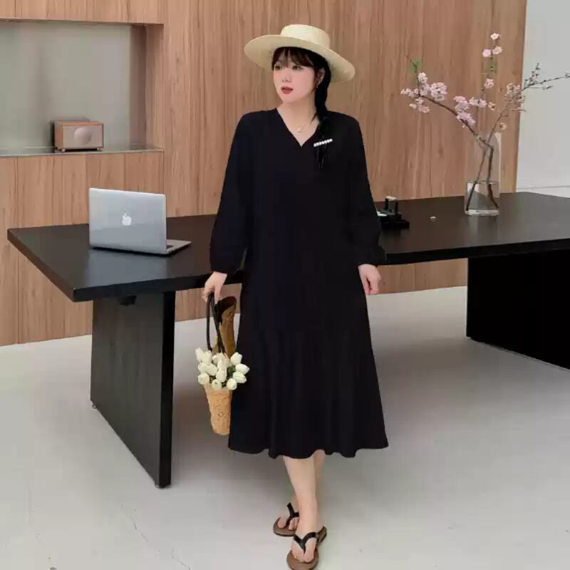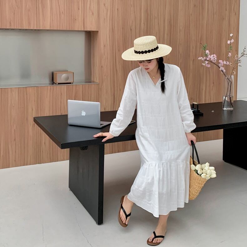 フェミニンワンピ フィッシュテール レディース ワンピース 膝下 長袖 Vネック ワイド フレア Aライン かわいい 大人可愛い きれいめ シンプル 上品 おしゃれ マニッシュ ガーリー ルーズ ラブリー キュート ベーシック カントリー ナチュラル 無地 ママ マタニティ デート お出かけ お泊まり 女子会 休日 カフェ オルチャン コーデ 楽ちん 体型カバー 美脚 脚長 普段使い 着回し モテ 清楚 インスタ映え XL 2XL 3XL 4XL 5XL 大きいサイズ ゆったり ゆる ホワイト ブラック | SPARKJOY レディースファッション