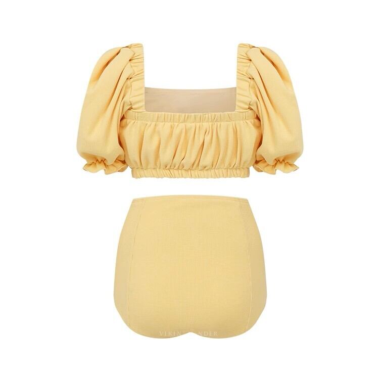 水着 ビキニ スイムウェア レディース タンキニ セパレート ビスチェ ノンワイヤー パッド付き 二の腕カバー 半袖 パフスリーブ フリル ウエストマーク ハイウエスト セット ツーピース 上下セット かわいい 大人可愛い きれいめ シンプル カジュアル おしゃれ お洒落 ラブリー キュート ガーリー セクシー フェミニン ヘルシー 無地 リゾート 旅行 温泉 プール 夏 海 美脚 着痩せ スタイルアップ 韓国 モテ 背中見せ 体型カバー こなれ感 M L XL イエロー 黄色 | SPARKJOY レディースファッション