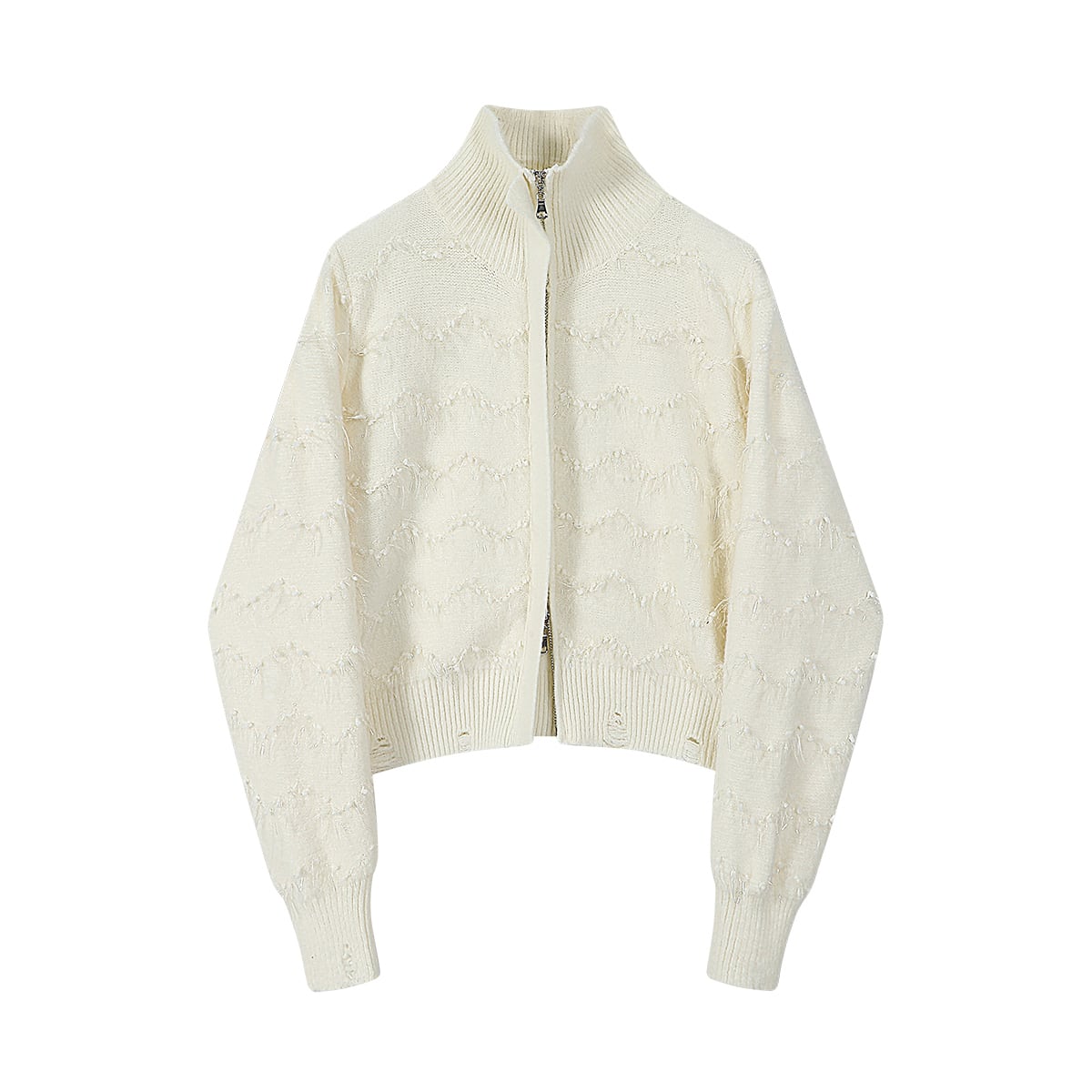 長袖で、前開きのファスナー仕様。ミディアム丈のニット素材で、カジュアルにもきれいめにも着こなせる優れものです。