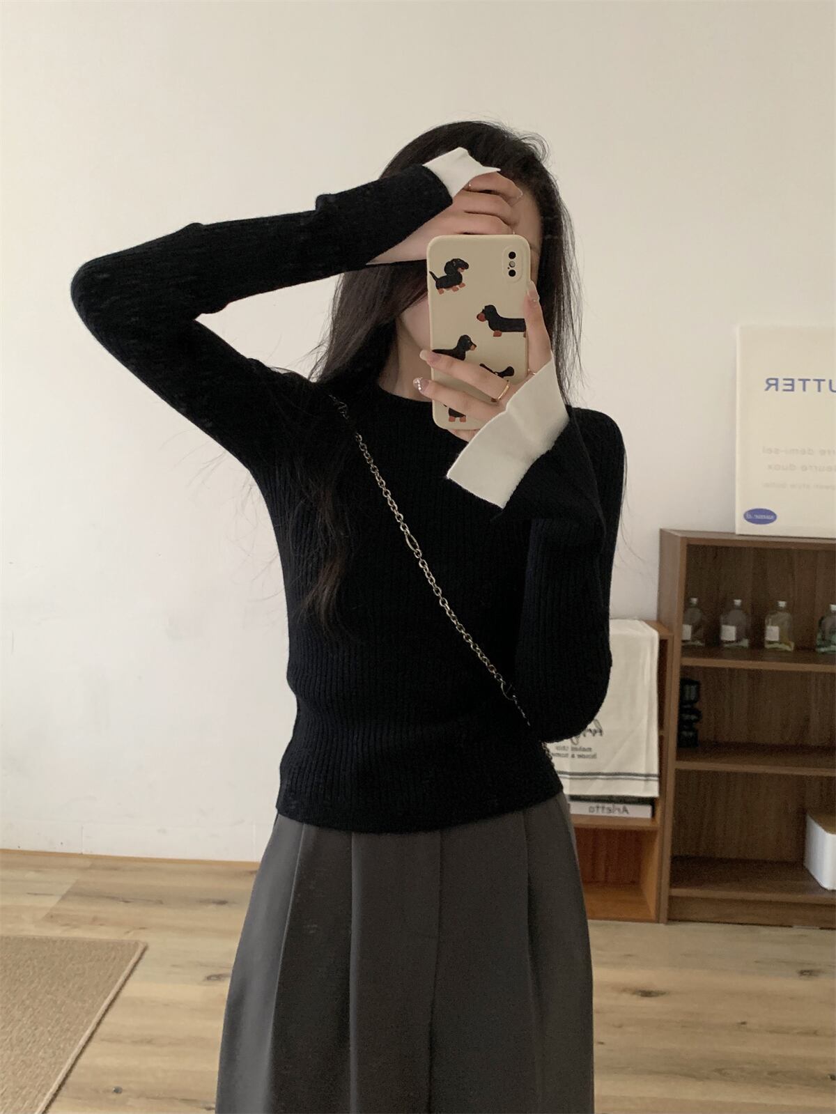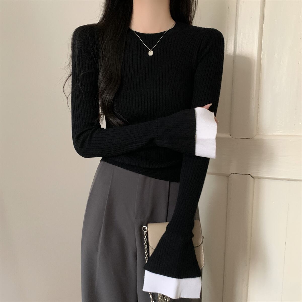 レディース トップス ニット セーター ミディアム 長袖 フレアスリーブ 萌袖 クルーネック 襟なし タイト スリム 細身 スマート バイカラー 配色 リブニット ストレッチ 伸縮性 大人可愛い きれいめ シンプル カジュアル 上品 おしゃれ かっこいい こなれ感 クール 都会的 無地 春 秋 冬 学生 学校 通学 デート お出かけ 旅行 女子会 休日 ショッピング ライブ 合コン カフェ フェス モノトーン 韓国 オルチャン コーデ 普段使い 着回し S M L XL 黒 ブラック グレー 大人カラー | SPARKJOY レディースファッション