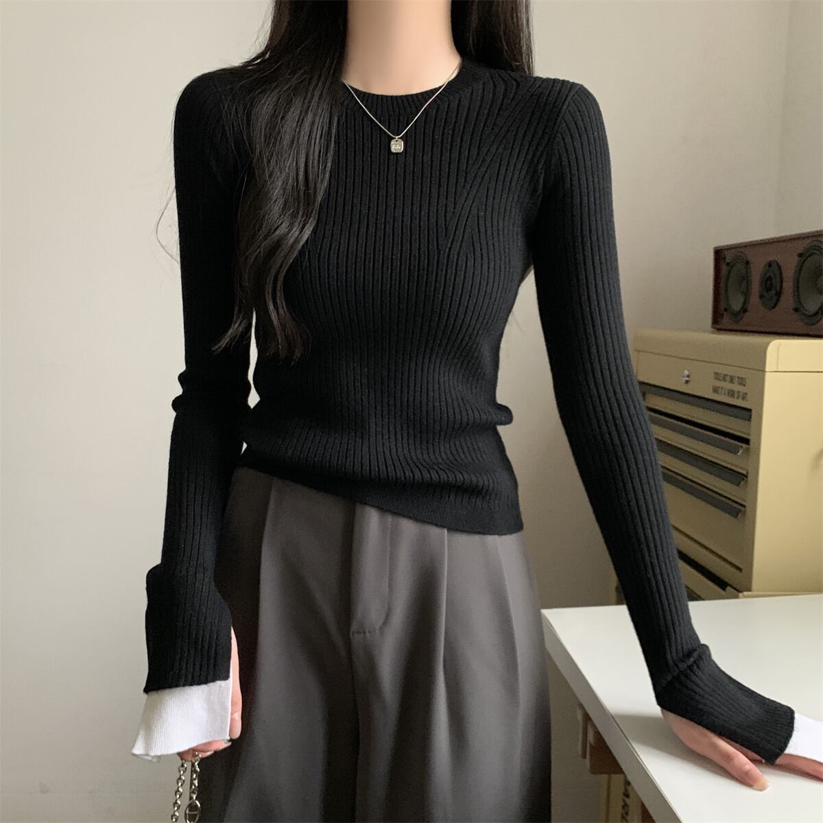 バイカラー配色のリブニットは、ストレッチ性があり、着心地も抜群です。春、秋、冬の季節に最適で、普段使いや通学、デート、お出かけ、旅行に大活躍するアイテムです。