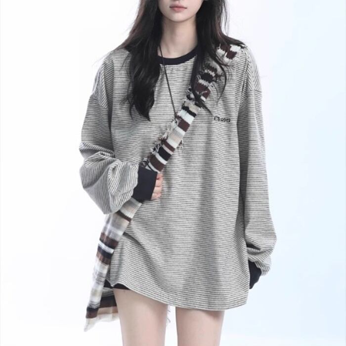 ボーダー ルーズ レディース トップス ロンT プルオーバー 部屋着 長袖 ラウンドネック シンプル カジュアル おしゃれ かっこいい レトロ こなれ感 ラフ メンズライク マニッシュ ボーイッシュ スポーティー ガーリー ルーズ 個性的 クール 抜け感 学生風 ベーシック アメリカン カントリー アクティブ ナチュラル ワイルド お出かけ 女子会 休日 重ね着 お揃い 双子 韓国 オルチャン コーデ 楽ちん 体型カバー 普段使い 着回し インスタ映え 定番 M L XL ゆったり ゆる ブラック グレー | SPARKJOY レディースファッション