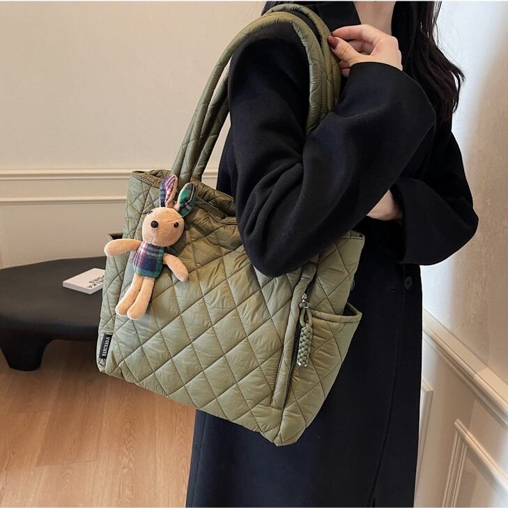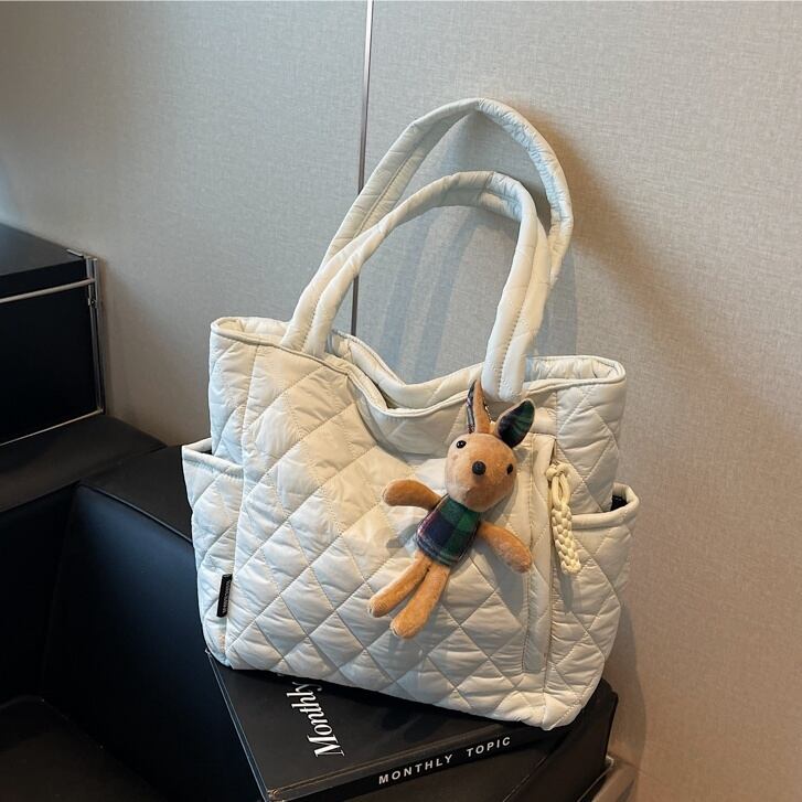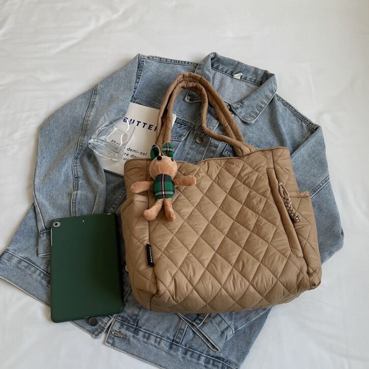 バッグ カバン レディース キルティング カジュアル チャーム付き ショルダー トート 肩がけ 手持ち 大容量 多収納 便利 軽量 薄型 スリム 自立 スクエア ポケット ファスナー かわいい 大人可愛い きれいめ シンプル お洒落 かっこいい こなれ感 ラフ キュート クール 抜け感 マニッシュ スタイリッシュ 通勤 通学 デート お出かけ 女子会 休日 普段使い 韓国 コーデ スタイル モテ インスタ映え ユニセックス 春 夏 秋 冬 シーズンレス 大きめ A4 カーキ ホワイト ブラック ブラウン | SPARKJOY レディースファッション