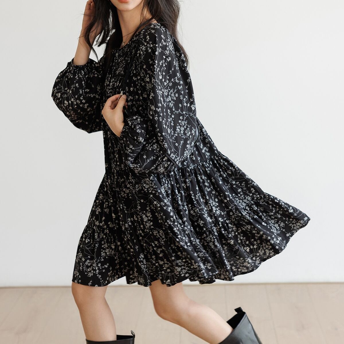 花柄ワンピ ミニワンピ フレア バルーン 長袖 ラウンドネック レディース ワンピース ミニ ショート 膝上 大人可愛い きれいめ シンプル 上品 おしゃれ かっこいい こなれ感 マニッシュ ガーリー ルーズ 個性的 モダン 抜け感 キュート ベーシック カントリー アクティブ ナチュラル デート お出かけ お泊まり 旅行 女子会 休日 ライブ 韓国 オルチャン コーデ 楽ちん 体型カバー 美脚 脚長 普段使い 着回し モテ 清楚 トレンド 流行 インスタ映え 定番 S M L ゆったり 黒 ブラック | SPARKJOY レディースファッション