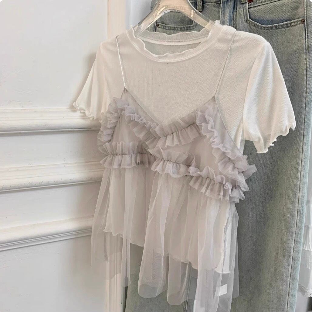大人可愛いデートTシャツが登場!シンプルでありながら、存在感を引き立てるミディアム丈のデザイン。袖あり半袖で、ラウンドネック・クルーネックの形状が女性らしく、デートや女子会、休日のお出かけなど、様々なシーンで活躍します。切り替えデザインや透け感のある素材が魅力で、軽やかさと上品さを兼ね備えています。2点セットのカットソーとキャミソールで、着回し力も抜群!