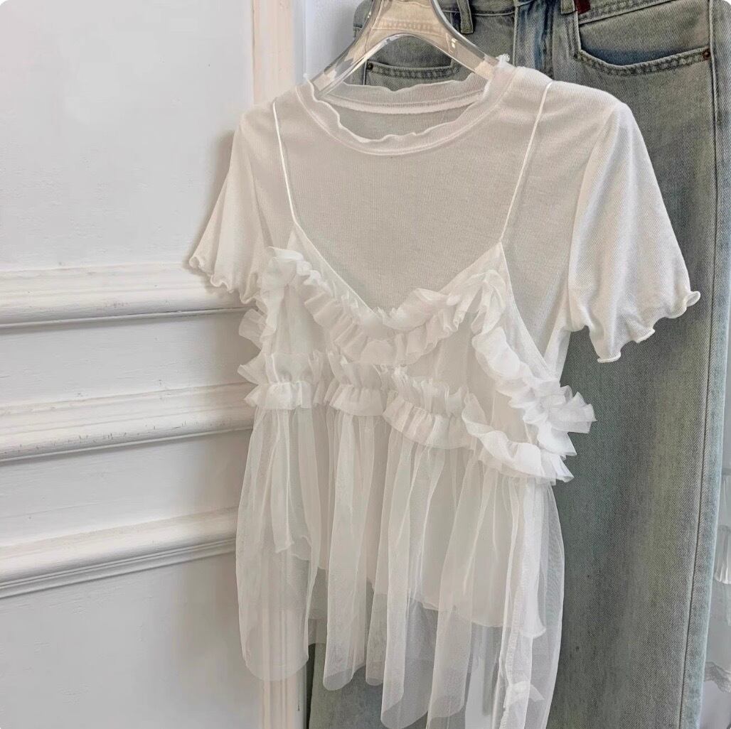 レディース トップス カットソー デート Tシャツ 白トップス ミディアム丈 袖あり 半袖 ラウンドネック クルーネック 襟なし ワイド 切り替えデザイン スマート レース フリル 透け感 シースルー 伸縮性 薄手 2点セット かわいい 大人可愛い きれいめ シンプル カジュアル 上品 おしゃれ お洒落 レトロ 大人女子 こなれ感 ラフ ラブリー キュート ガーリー エレガント 主役級 存在感 抜け感 デート お出かけ 女子会 休日 着回し 普段使い ファッション コーデ スタイル モテ 定番 | SPARKJOY レディースファッション