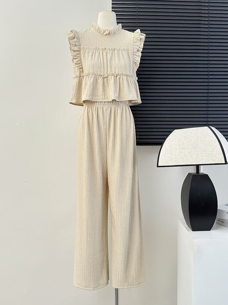 フェミニンなデザインが、春や夏のデートや旅行、お出かけにぴったりです。袖なしのスタンドカラーとフリルのディテールが生む華やかさは、女子会でも注目を集めること間違いなし。ハイウエストのストレートワイドパンツが脚長効果を実現し、シンプルで上品なスタイルを演出します。