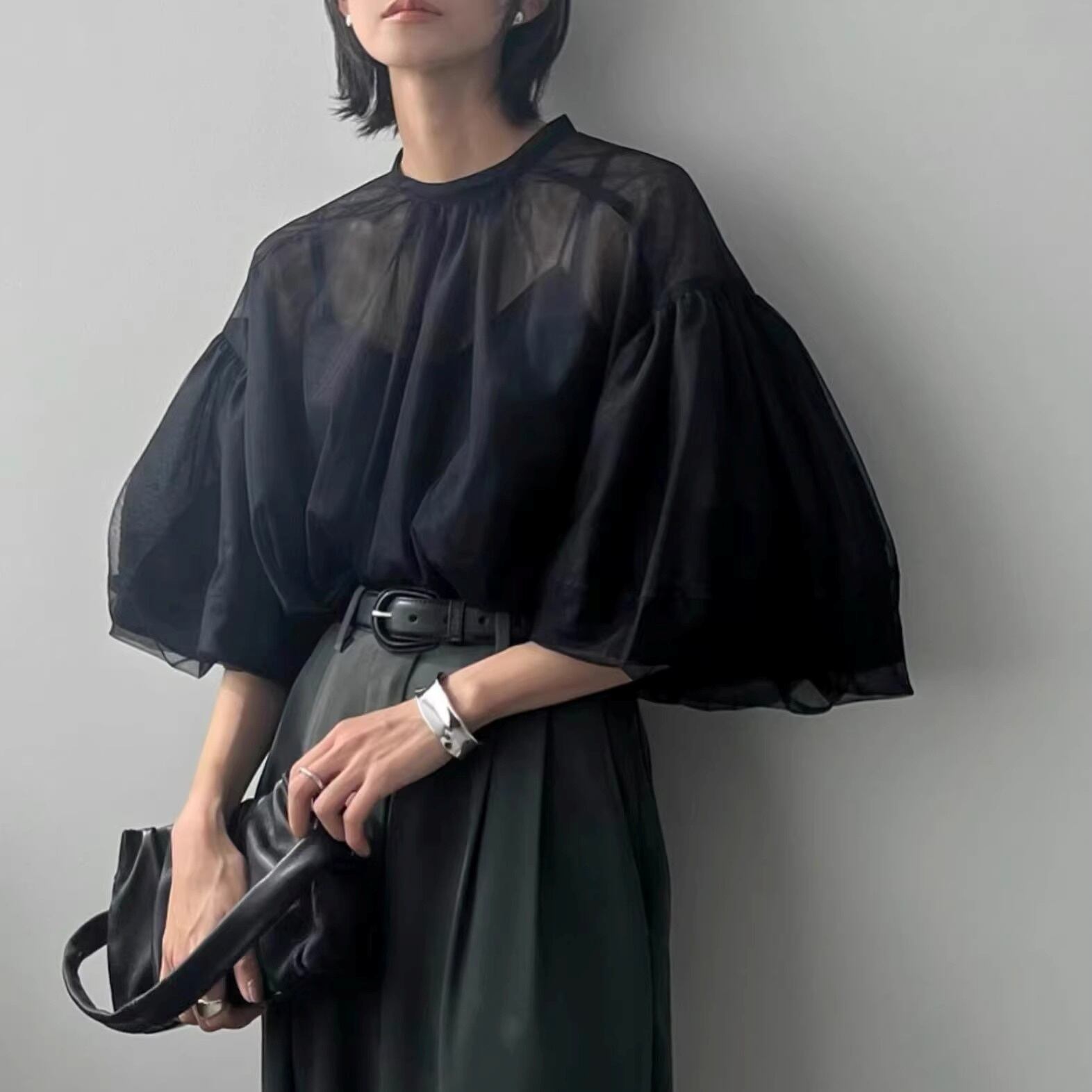 ボリューム袖が特徴的で、シースルーの透け感が大人可愛い雰囲気を演出します。