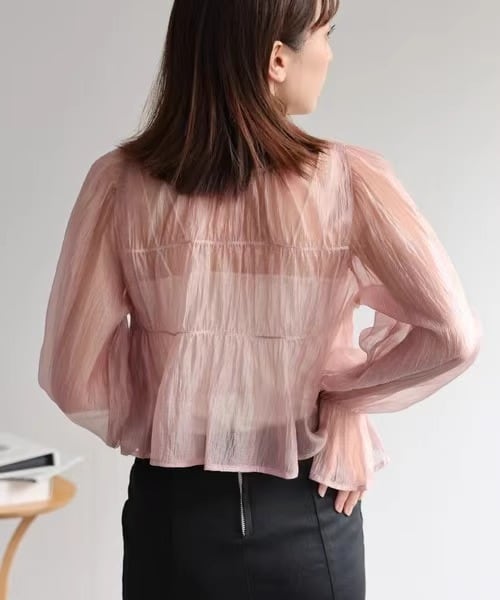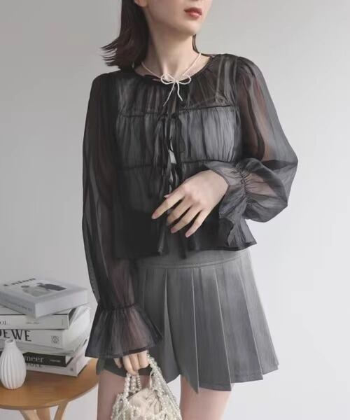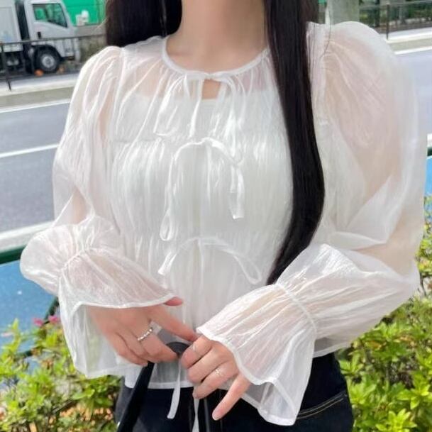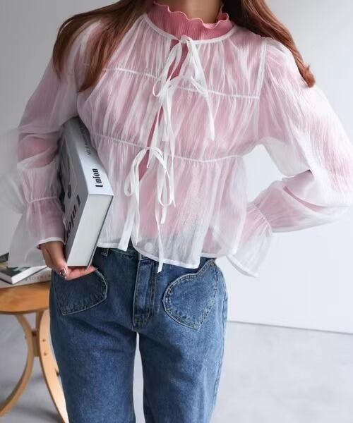 トップス シャツ ブラウス 長袖 クルーネック 前開き リボン ショート丈 シースルー 透け感 かわいい 大人可愛い きれいめ シンプル 上品 おしゃれ かっこいい カジュアル こなれ感 個性的 主役級 存在感 抜け感 春 夏 ベーシック ナチュラル キュート フェミニン ガーリー 無地 女性用 レディース ママ OL 通勤 オフィス 学生 通学 デート お出かけ お泊まり 女子会 旅行 休日 カフェ ショッピング コンパ イベント 普段使い デイリー 着回し 重ね着 ワンサイズ トレンド モテ | SPARKJOY レディースファッション