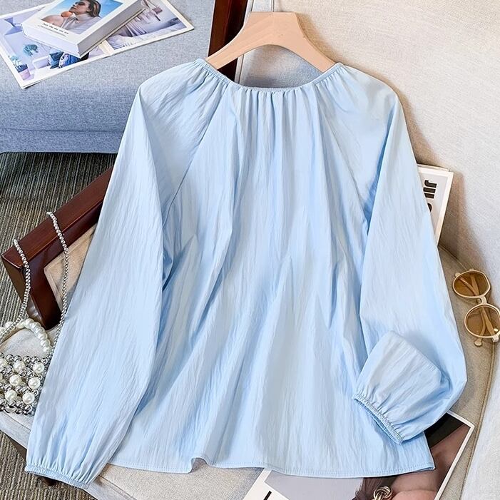 トップス ブラウス 長袖 ラウンドネック プルオーバー ショート丈 シャーリング かわいい 大人可愛い きれいめ シンプル 上品 おしゃれ かっこいい カジュアル レトロ こなれ感 個性的 主役級 存在感 抜け感 春 夏 ベーシック ナチュラル フェミニン 清楚 無地 女性用 レディース ママ OL 通勤 オフィス 学生 通学 デート お出かけ お泊まり 女子会 旅行 休日 アウトドア カフェ ショッピング イベント 普段使い デイリー 着回し 重ね着 M L XL 2XL 3XL 4XL トレンド モテ | SPARKJOY レディースファッション
