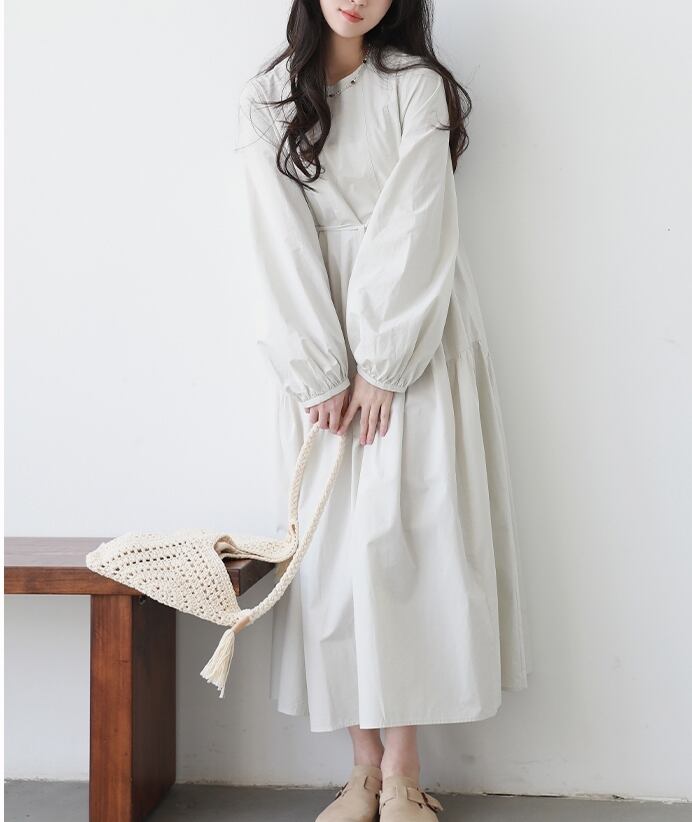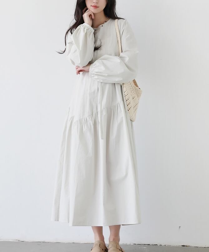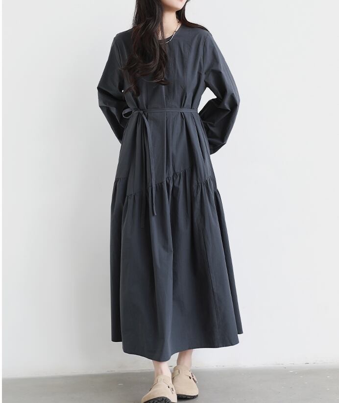ワンピース ロングワンピース 長袖 ボリューム袖 クルーネック ウエストリボン アシンメトリー ロング丈 かわいい 大人可愛い きれいめ シンプル 上品 おしゃれ カジュアル こなれ感 個性的 主役級 存在感 抜け感 春 夏 ベーシック ナチュラル フェミニン ガーリー 清楚 無地 女性用 レディース ママ マタニティ OL 通勤 オフィス 学生 通学 デート お出かけ お泊まり 女子会 旅行 休日 カフェ ショッピング コンパ イベント 普段使い デイリー 着回し 重ね着 S M L ゆったり | SPARKJOY レディースファッション