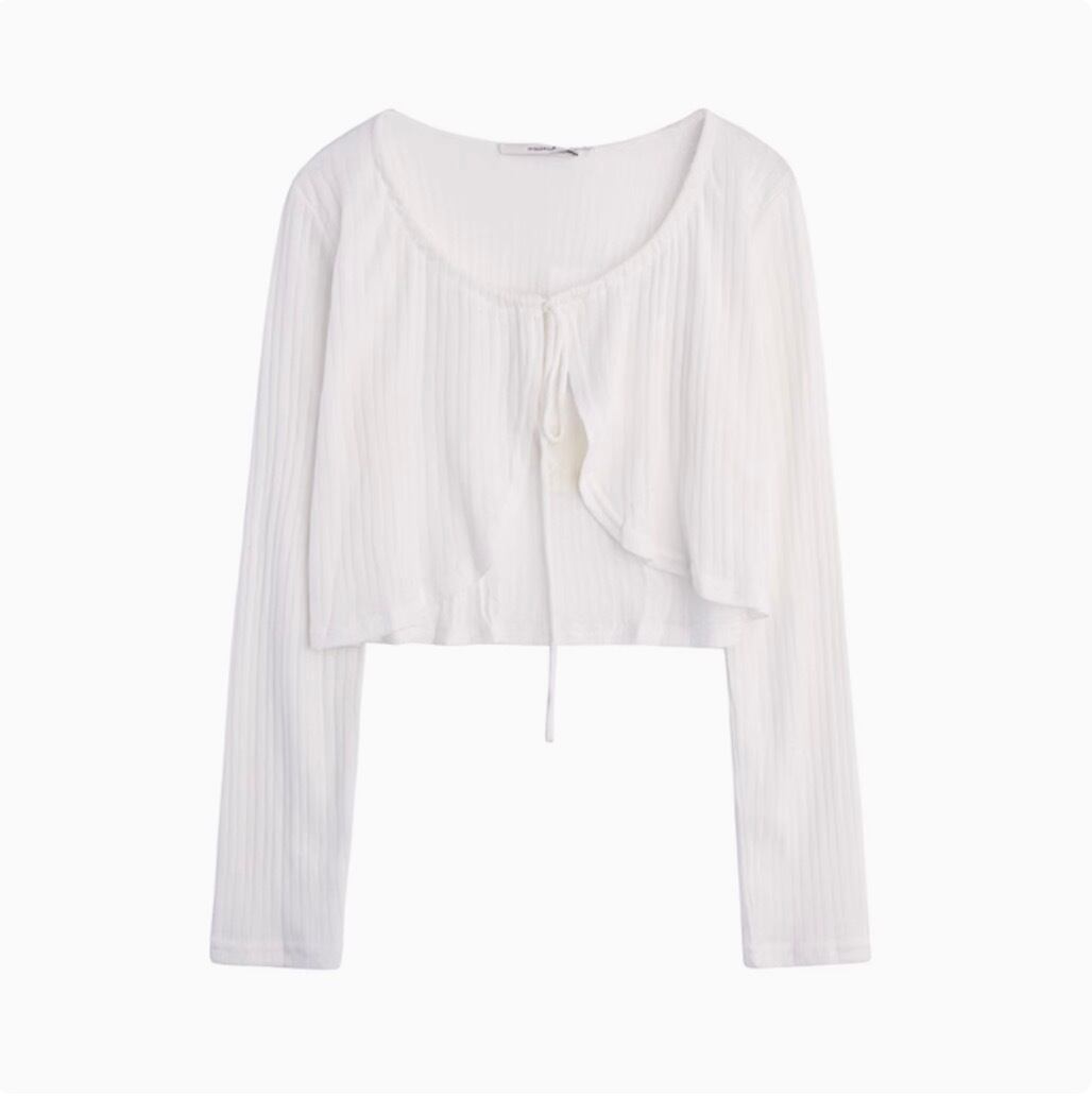 大人可愛いショート丈カーディガンです!袖ありの長袖デザインとラウンドネックが、シンプルながらもおしゃれな印象を与えます。リボン付きの切り替えデザインが個性的で、どんなスタイルにも合わせやすい一着です。デートや女子会、休日のお出かけにもぴったりなアイテムです!
