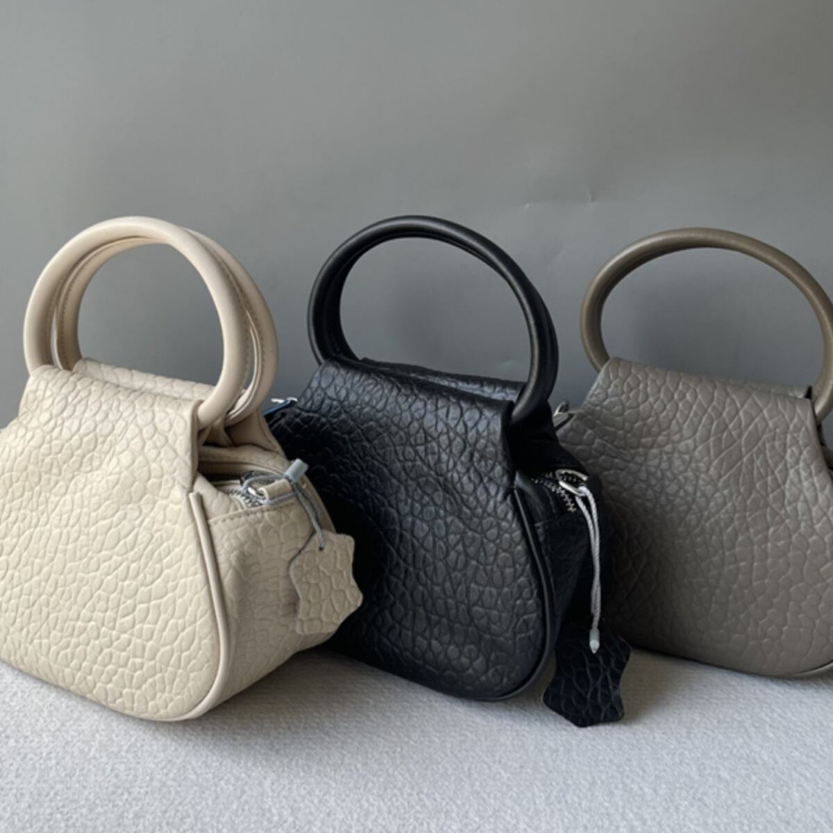 ファスナー付きの仕切りデザインが便利で、革製の丸型が特徴のコンパクトミニバッグです。