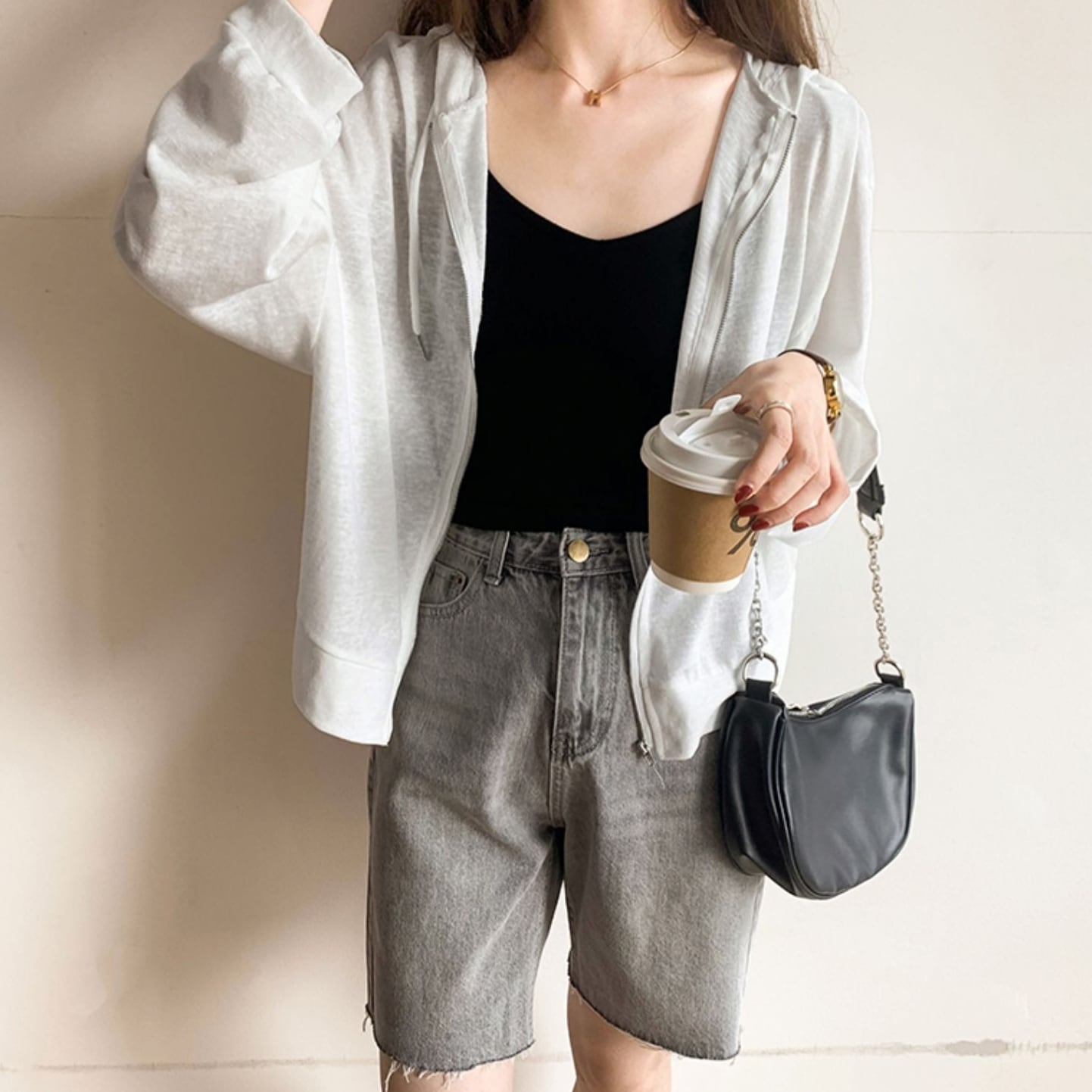 トップス パーカー フーディー 半袖 前開き ファスナー ミディアム丈 透け感 薄手 可愛い かわいい 大人可愛い きれいめ シンプル 上品 レトロ おしゃれ かっこいい カジュアル こなれ感 個性的 主役級 存在感 抜け感 春 夏 ベーシック ナチュラル クール メンズライク 無地 女性用 レディース ママ OL 通勤 オフィス 学生 通学 デート お出かけ お泊まり 女子会 旅行 リゾート 休日 カフェ ショッピング コンパ イベント 普段使い デイリー 着回し 重ね着 ワンサイズ 定番アイテム | SPARKJOY レディースファッション