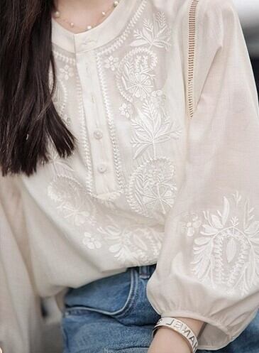 繊細な刺繍ディテールが目を引くブラウス。フロントにあしらわれたモチーフが華やかさを添えつつ、上品で柔らかな印象を演出します。すっきりとしたヘンリーネックが顔まわりを明るく見せ、優しい雰囲気を引き立てます。