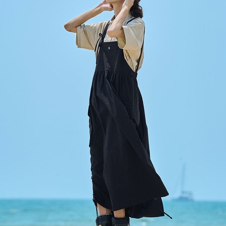 このジャンパースカートは、ポケット付きでシャーリングデザインが施されています。