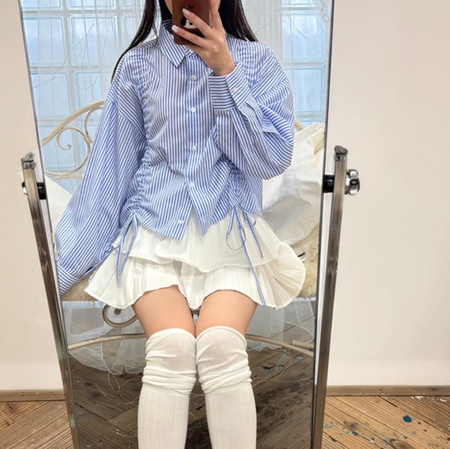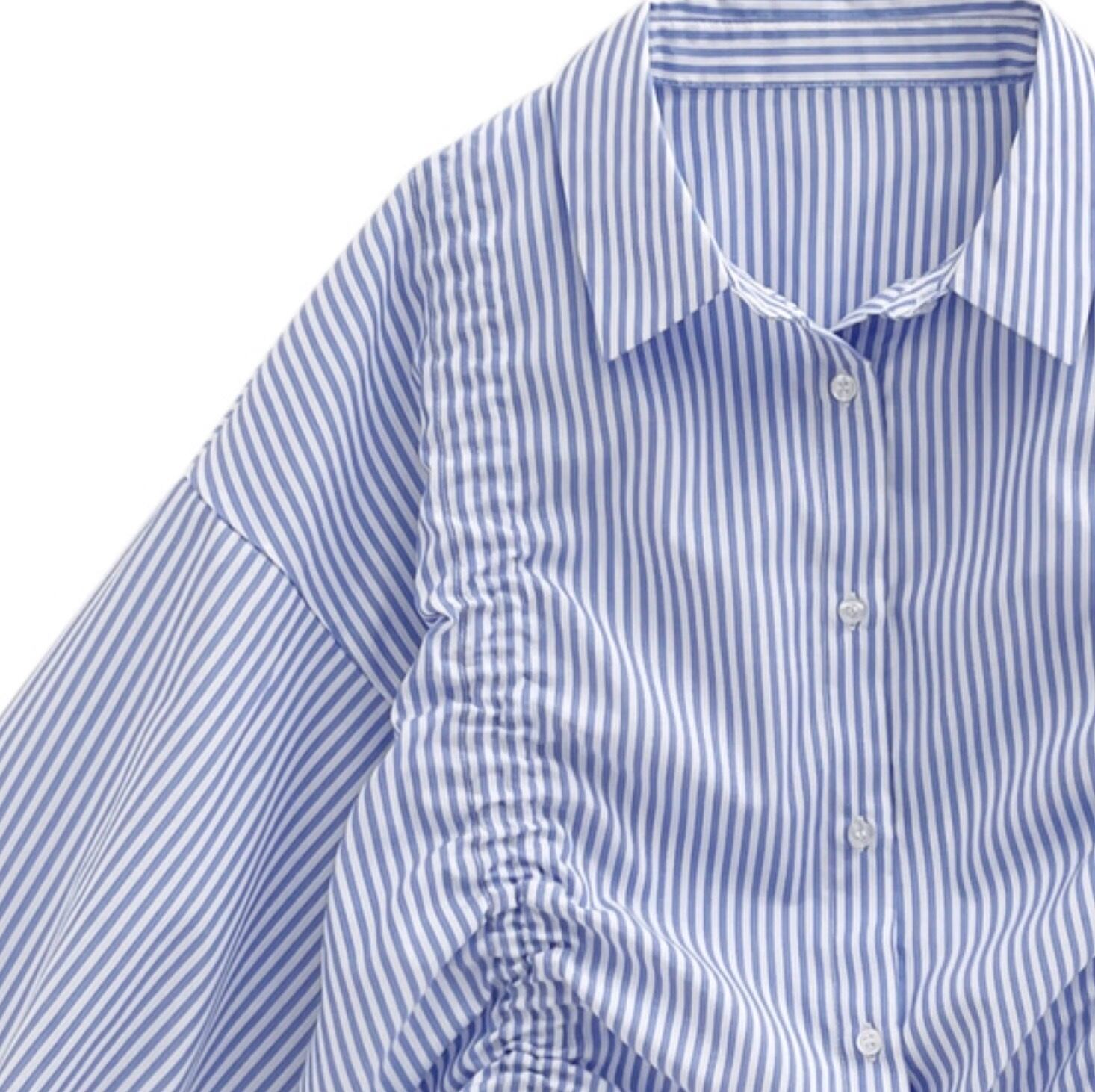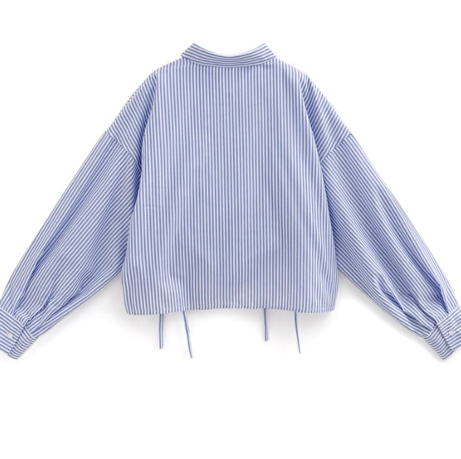 デートや女子会、休日のお出かけにぴったりな、ボリューム袖と切り替えデザインが魅力のミディアム丈ブラウスです。爽やかなピンストライプが上品さを演出し、リボン付きの襟元がガーリーで可愛らしい印象を与えます。シンプルながらも存在感のある一着で、大人可愛いコーディネートを楽しめます。