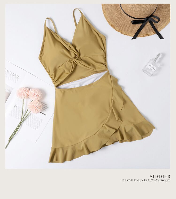 お腹開きのクロスデザインで、フリル付きのスカートが女性らしさを引き立てます。