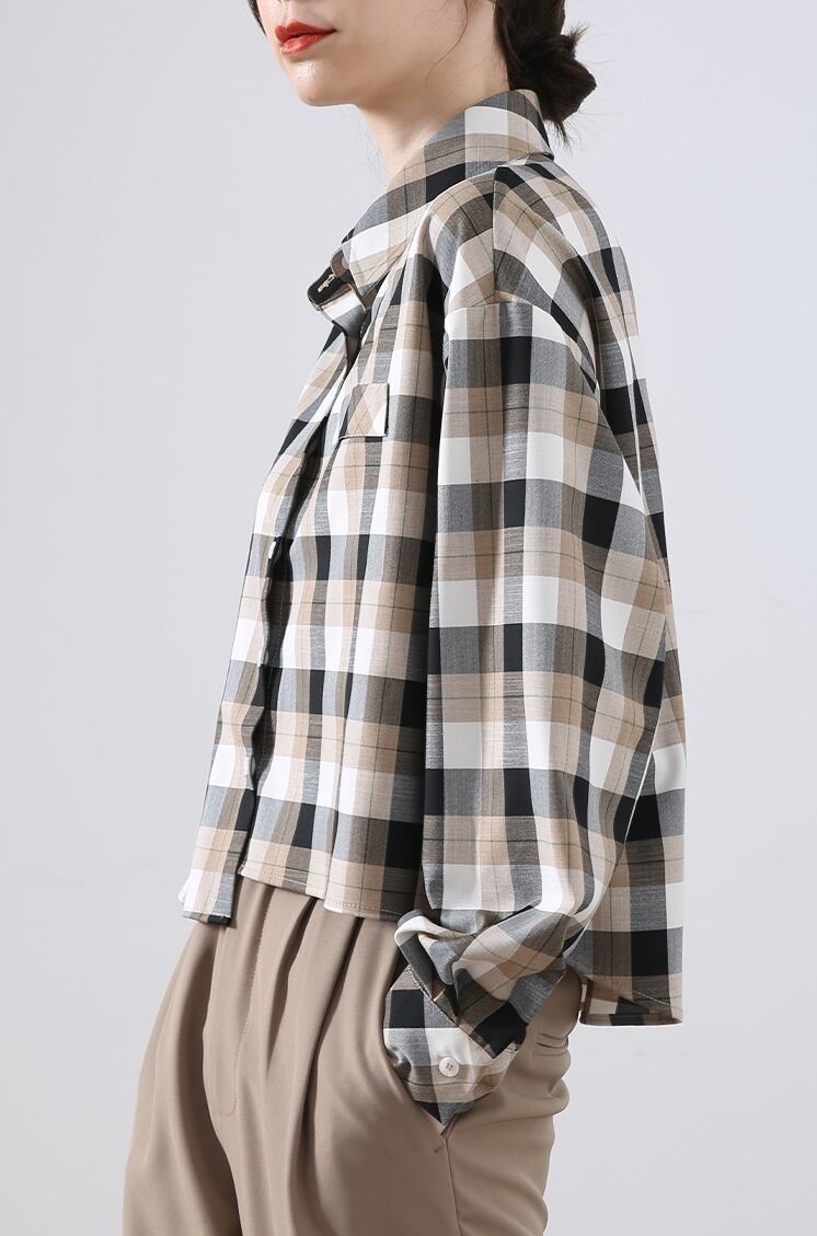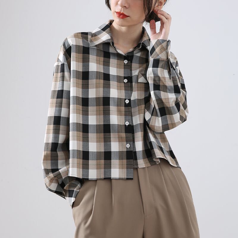 トップス シャツ 長袖 襟付き 前開き ボタン ショート丈 アシンメトリー 可愛い かわいい 大人可愛い きれいめ シンプル 上品 レトロ おしゃれ かっこいい カジュアル こなれ感 個性的 主役級 存在感 抜け感 春 秋 ベーシック ナチュラル クール メンズライク チェック柄 女性用 レディース ママ OL 通勤 オフィス 学生 通学 デート お出かけ お泊まり 女子会 旅行 リゾート 休日 カフェ ショッピング コンパ イベント 普段使い デイリー 着回し 重ね着 M L トレンド モテ | SPARKJOY レディースファッション