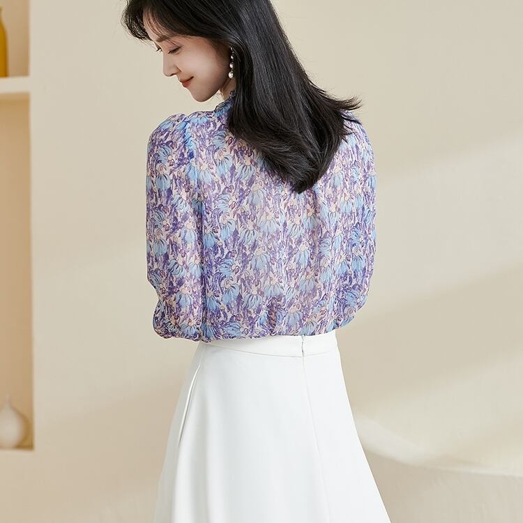 このブラウスは、パフスリーブとボリューム袖が特徴で、リボンタイがついているため、ほどよいフェミニンさを演出します。