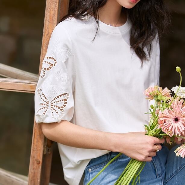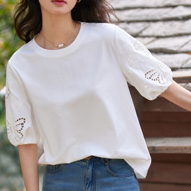 トップス カットソー Tシャツ 5分袖 クルーネック プルオーバー ミディアム丈 刺繡 可愛い かわいい 大人可愛い きれいめ シンプル 上品 レトロ おしゃれ かっこいい カジュアル こなれ感 個性的 主役級 存在感 抜け感 春 夏 ベーシック ナチュラル キュート 清楚 無地 女性用 レディース OL 通勤 オフィス 学生 通学 デート お出かけ お泊まり 女子会 旅行 リゾート 休日 カフェ ショッピング コンパ イベント 普段使い デイリー 着回し 重ね着 S M L XL トレンド モテ | SPARKJOY レディースファッション