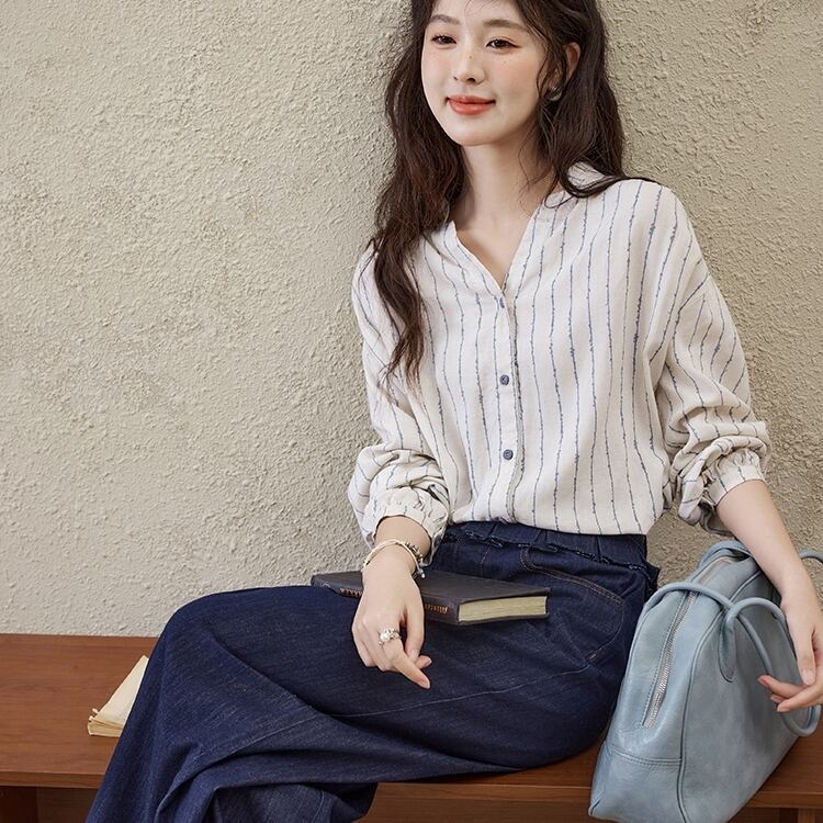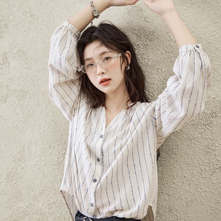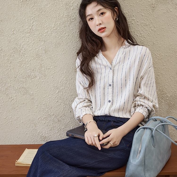 トップス シャツ 長袖 Vネック 前開き ボタン ミディアム丈 ボリューム袖 可愛い かわいい 大人可愛い きれいめ シンプル 上品 レトロ おしゃれ かっこいい カジュアル こなれ感 ルーズ 個性的 主役級 存在感 抜け感 春 夏 ベーシック ナチュラル フェミニン 清楚 ストライプ 女性用 レディース OL 通勤 オフィス 学生 通学 デート お出かけ お泊まり 女子会 旅行 リゾート 休日 カフェ ショッピング コンパ イベント 普段使い デイリー 着回し 重ね着 S M L トレンド モテ | SPARKJOY レディースファッション