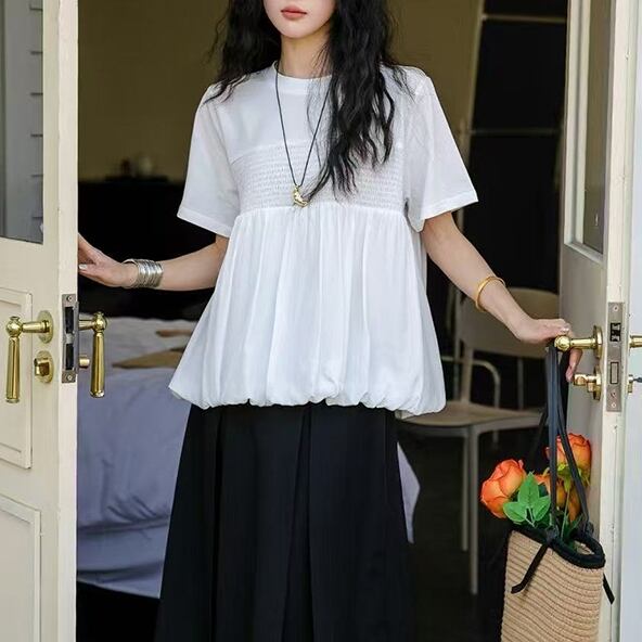 トップス シャツ 半袖 クルーネック プルオーバー ショート丈 切り替えデザイン 可愛い かわいい 大人可愛い きれいめ シンプル 上品 レトロ おしゃれ かっこいい カジュアル こなれ感 個性的 主役級 存在感 抜け感 春 夏 ベーシック ナチュラル フェミニン ガーリー 清楚 無地 女性用 レディース OL 通勤 オフィス 学生 通学 デート お出かけ お泊まり 女子会 旅行 リゾート 休日 カフェ ショッピング コンパ イベント 普段使い デイリー 着回し 重ね着 ワンサイズ トレンド モテ | SPARKJOY レディースファッション
