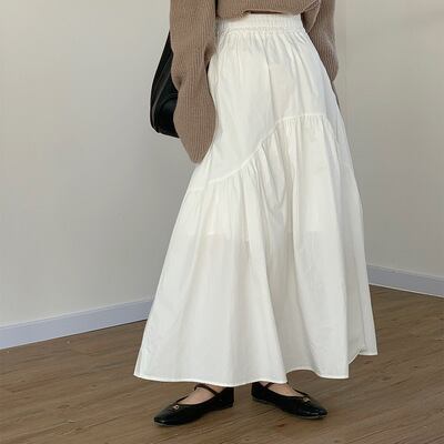 ウエストゴムで楽ちんに履けるこのロングスカートは、カジュアルながらも上品さを兼ね備えています。